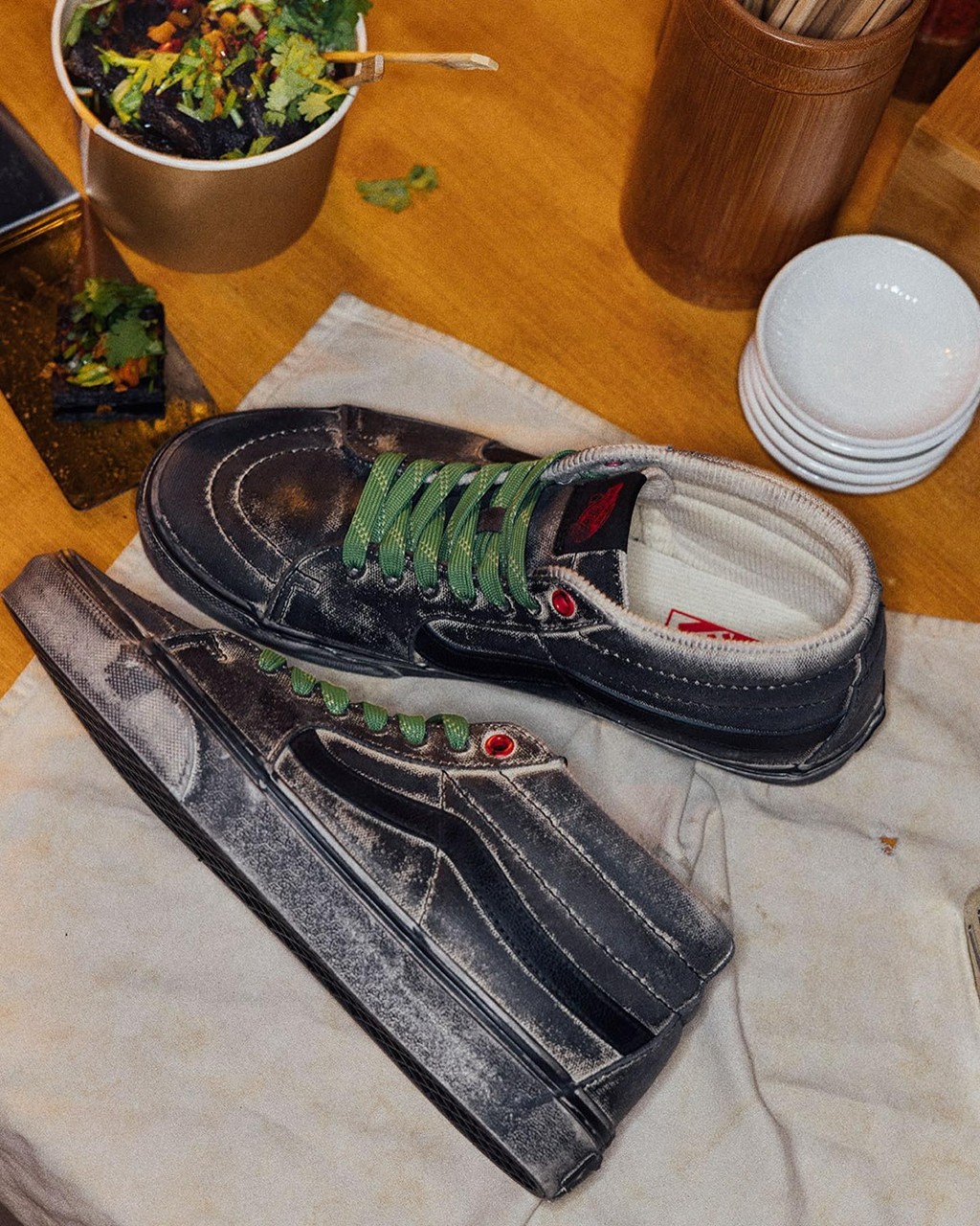 最后的重头戏,当然是老长沙臭豆腐配色的 SK8 Mid,黑色鞋面点缀少许斑驳,再加上绿色鞋带代表的香菜,真有内味儿了!