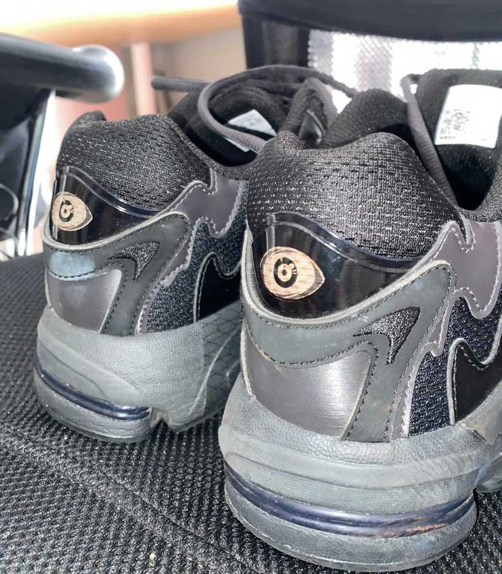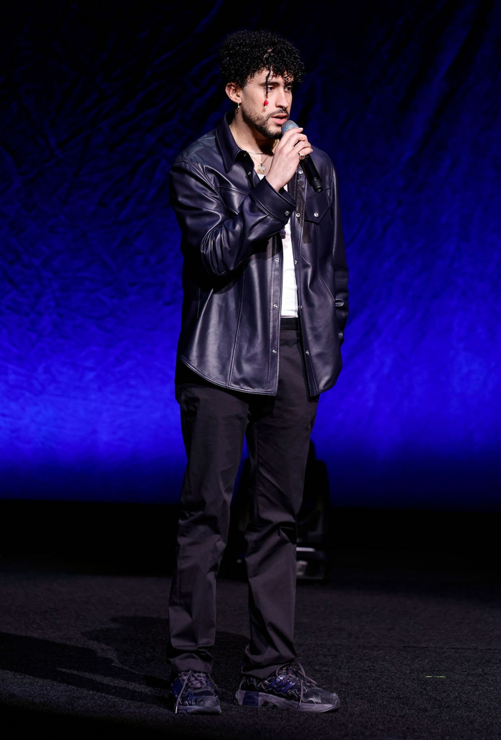整鞋配色以黑色为主,和 Bad Bunny 本人穿着的黑色西装相得益彰,鞋身两侧三道杠 Logo 采用深蓝色点缀,让鞋面看起来并不单调。