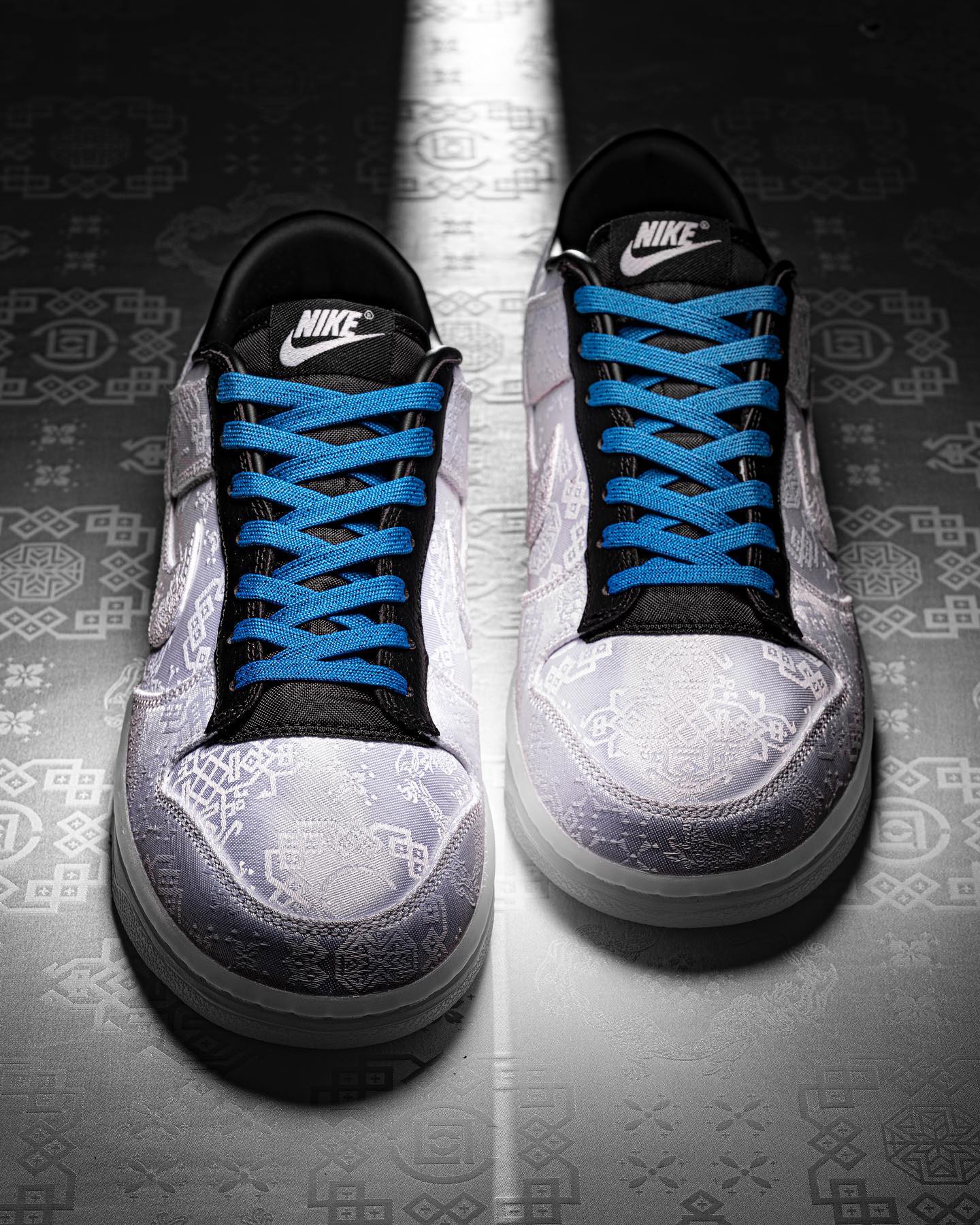 作为冠希 CLOT 庆祝成立二十周年的重头戏,「闪电白丝绸」CLOT x Fragment Design x Nike Dunk Low 无疑是球鞋玩家们关注的重中之重!