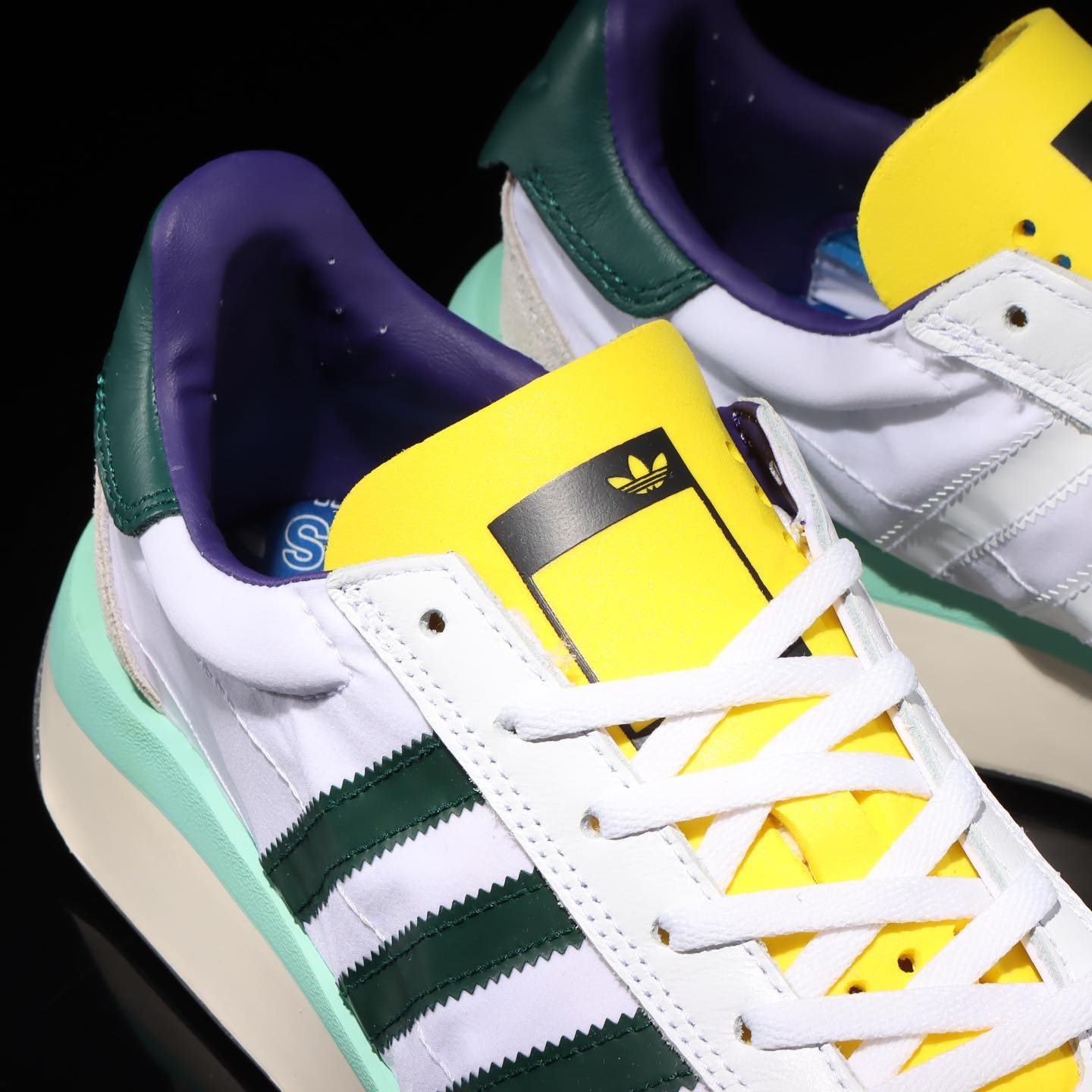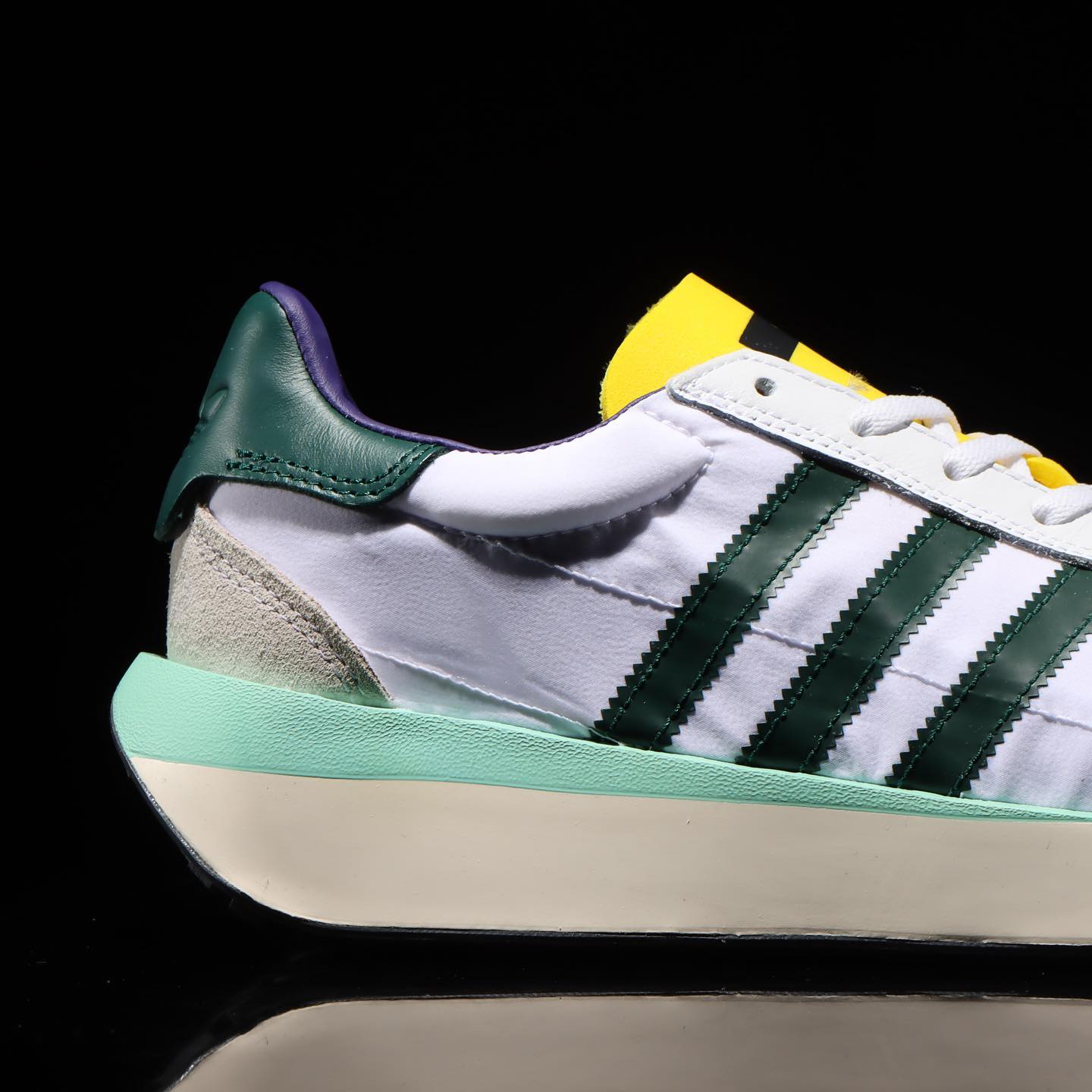 全新的 adidas Originals COUNTRY XLG 以经典 COUNTRY 造型示人,白色的鞋身辅以绿、紫和黄多种撞色点缀,视觉效果复古又时尚。