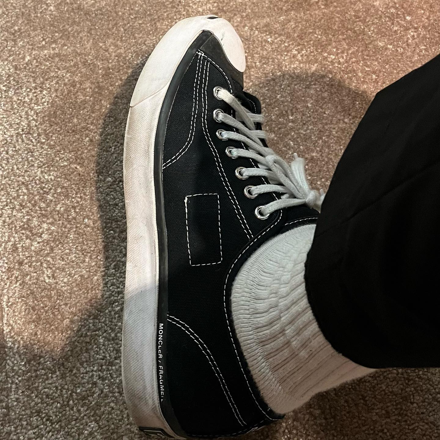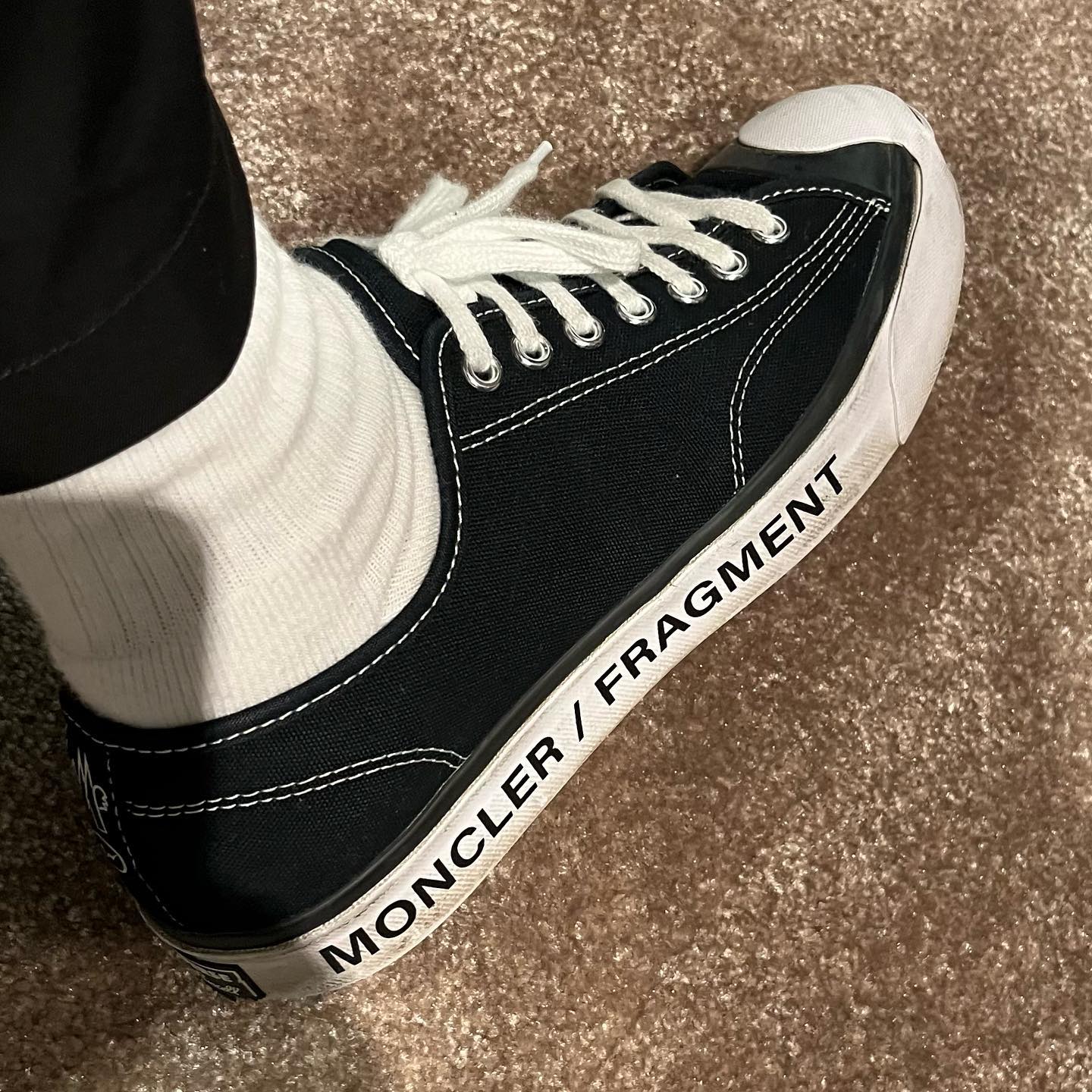 晒出的这双三方联名新鞋,来自 Moncler、fragment design、Converse。