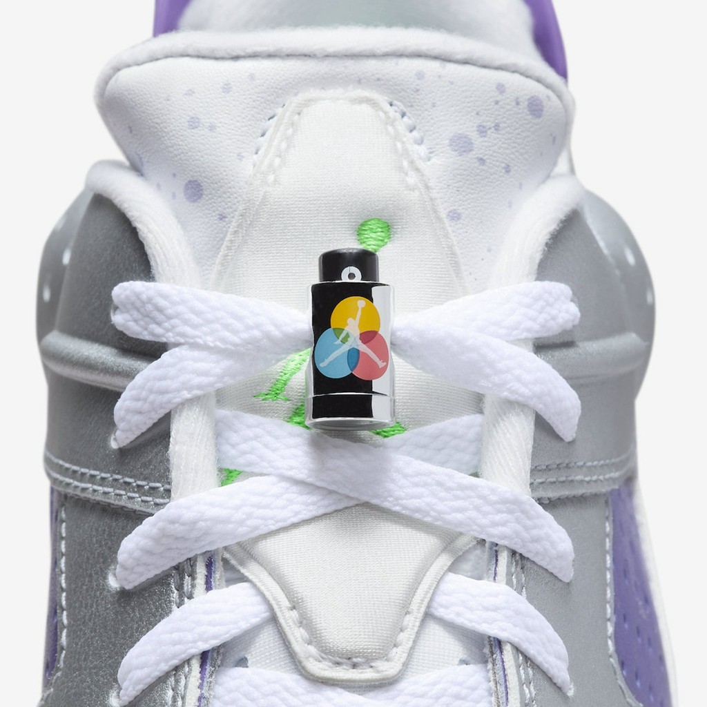 中底为紫色泼墨造型,其他细节包括镀铬的鞋带扣和后跟拉环,突出细节表现。