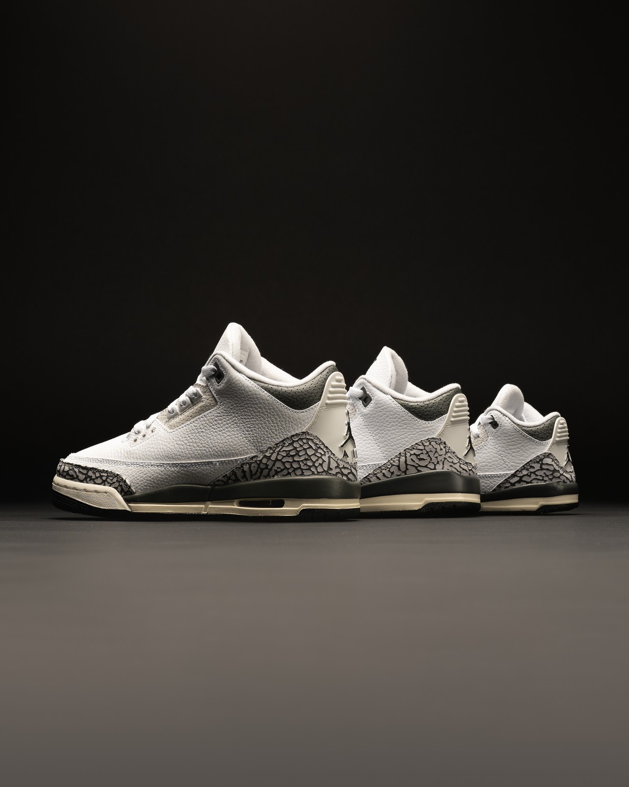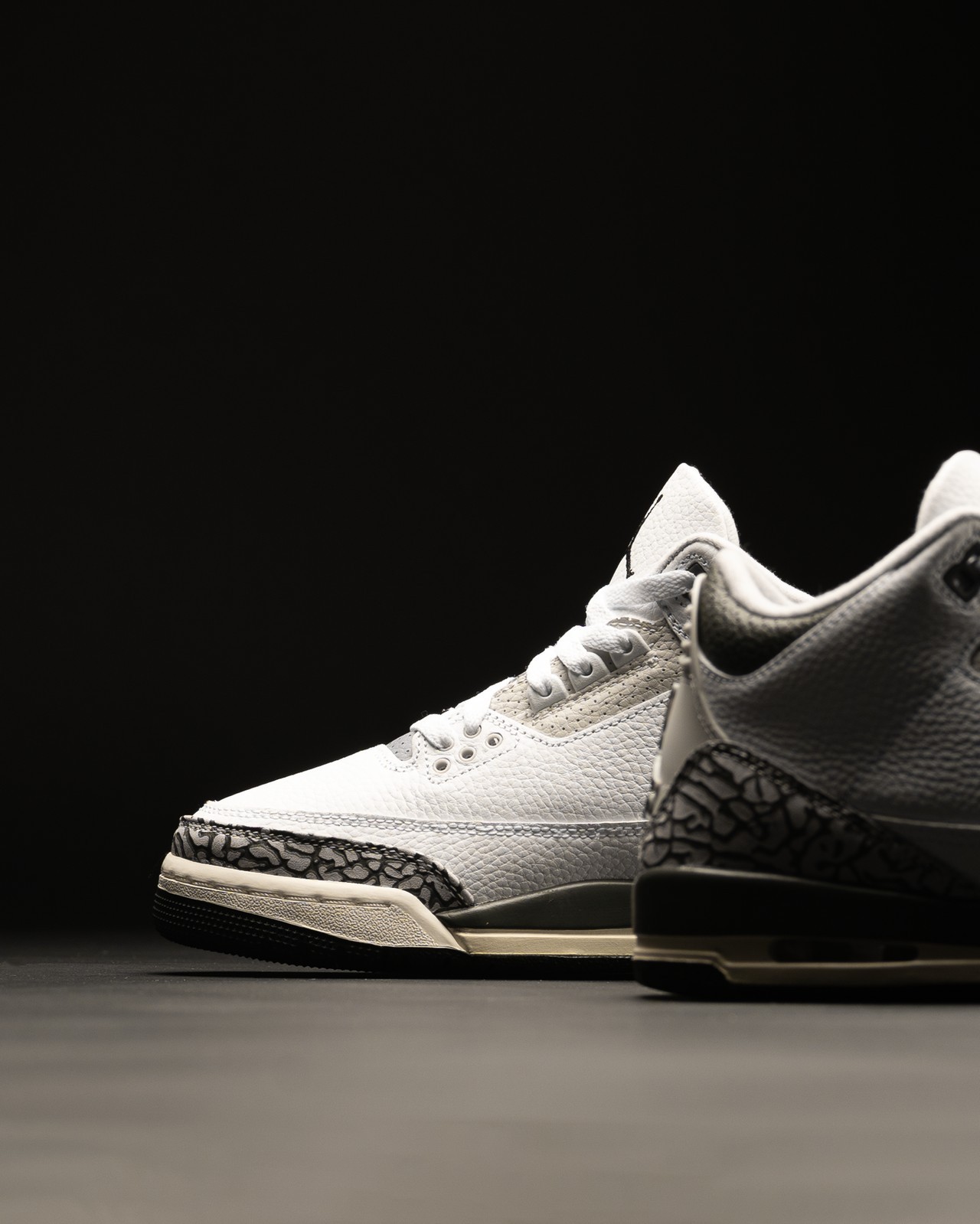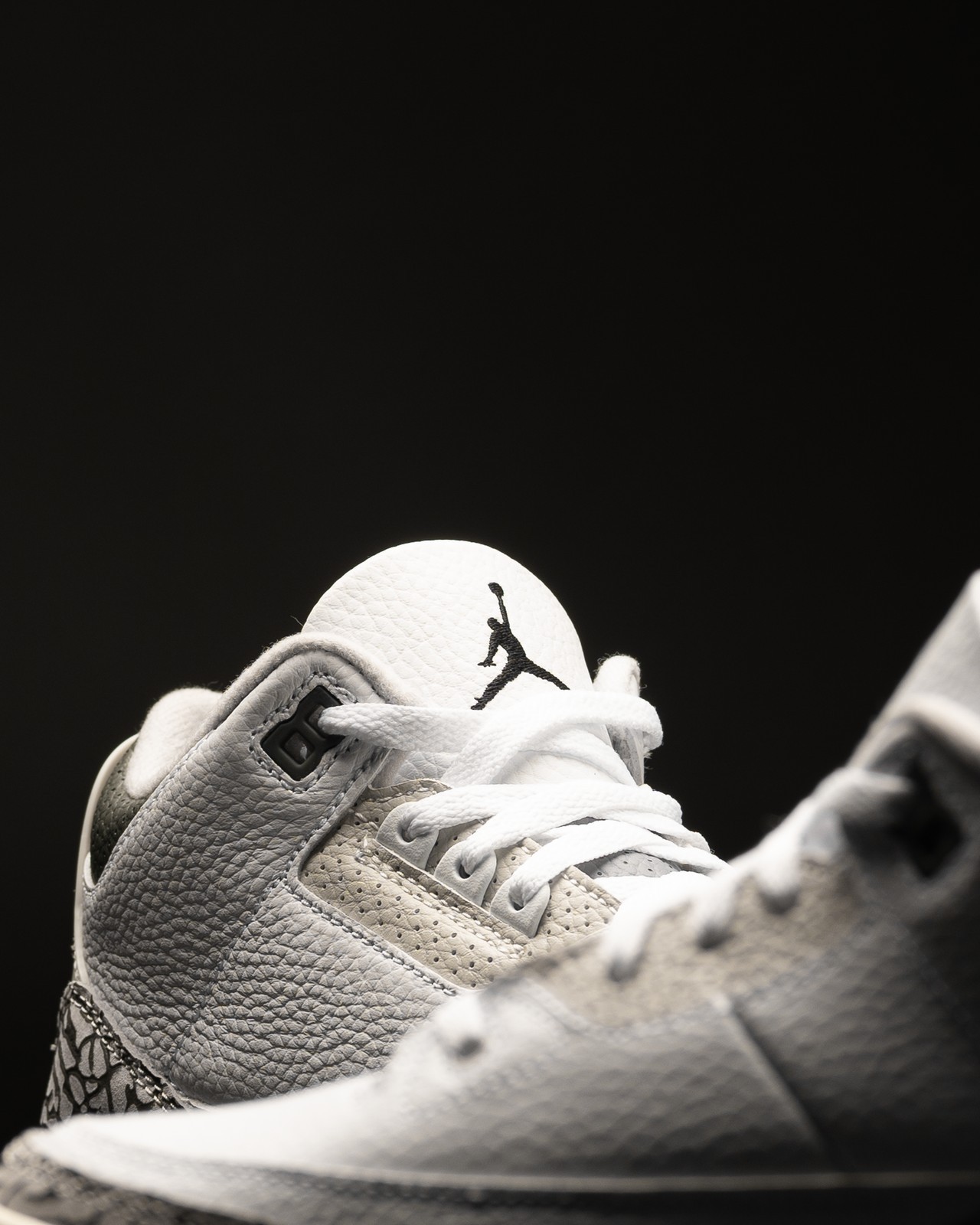 整双鞋采用纯白色荔枝皮鞋面搭配灰色调点缀,带来熟悉的 Air Jordan 3 的质感表现。