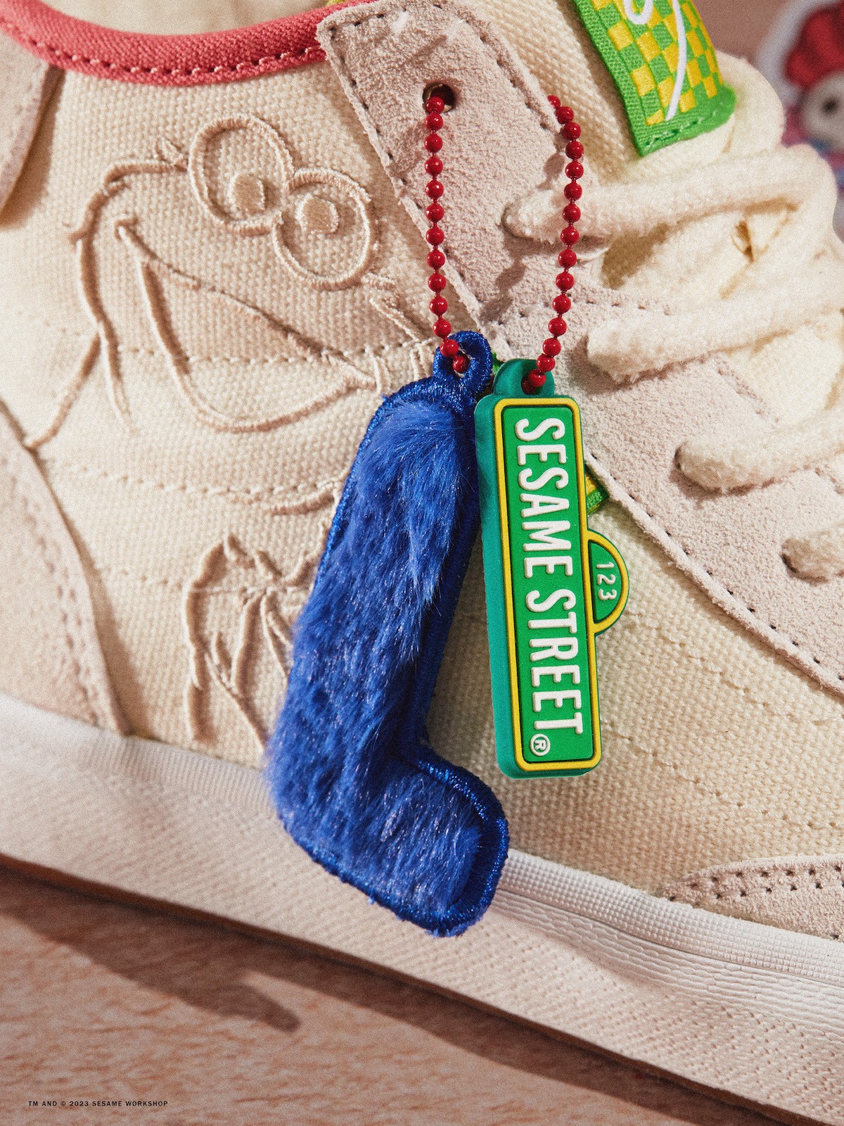 侧身鞋帮位置用刺绣手法缀以艾摩、大鸟、甜饼怪及奥斯卡形象,彰显联名身份。