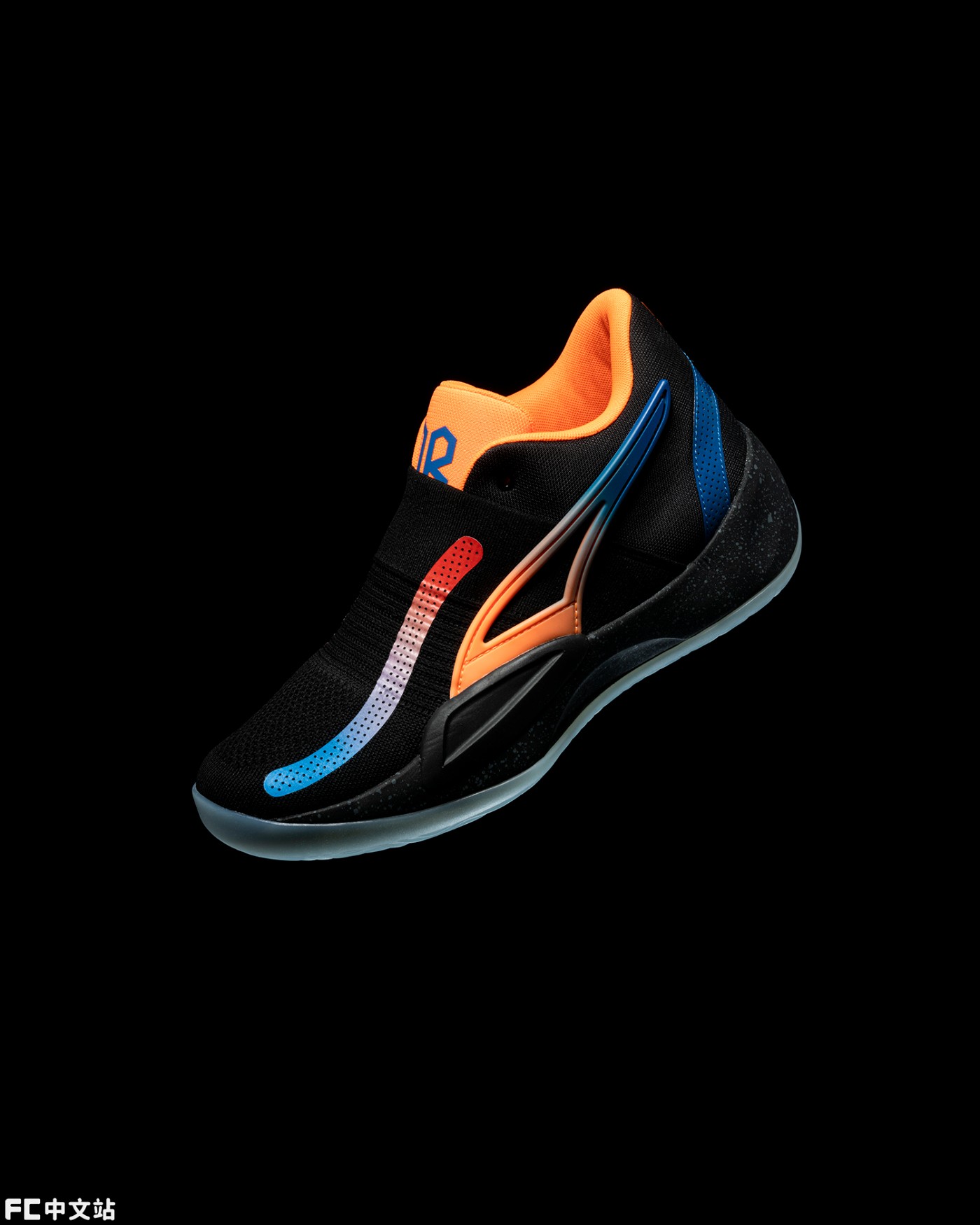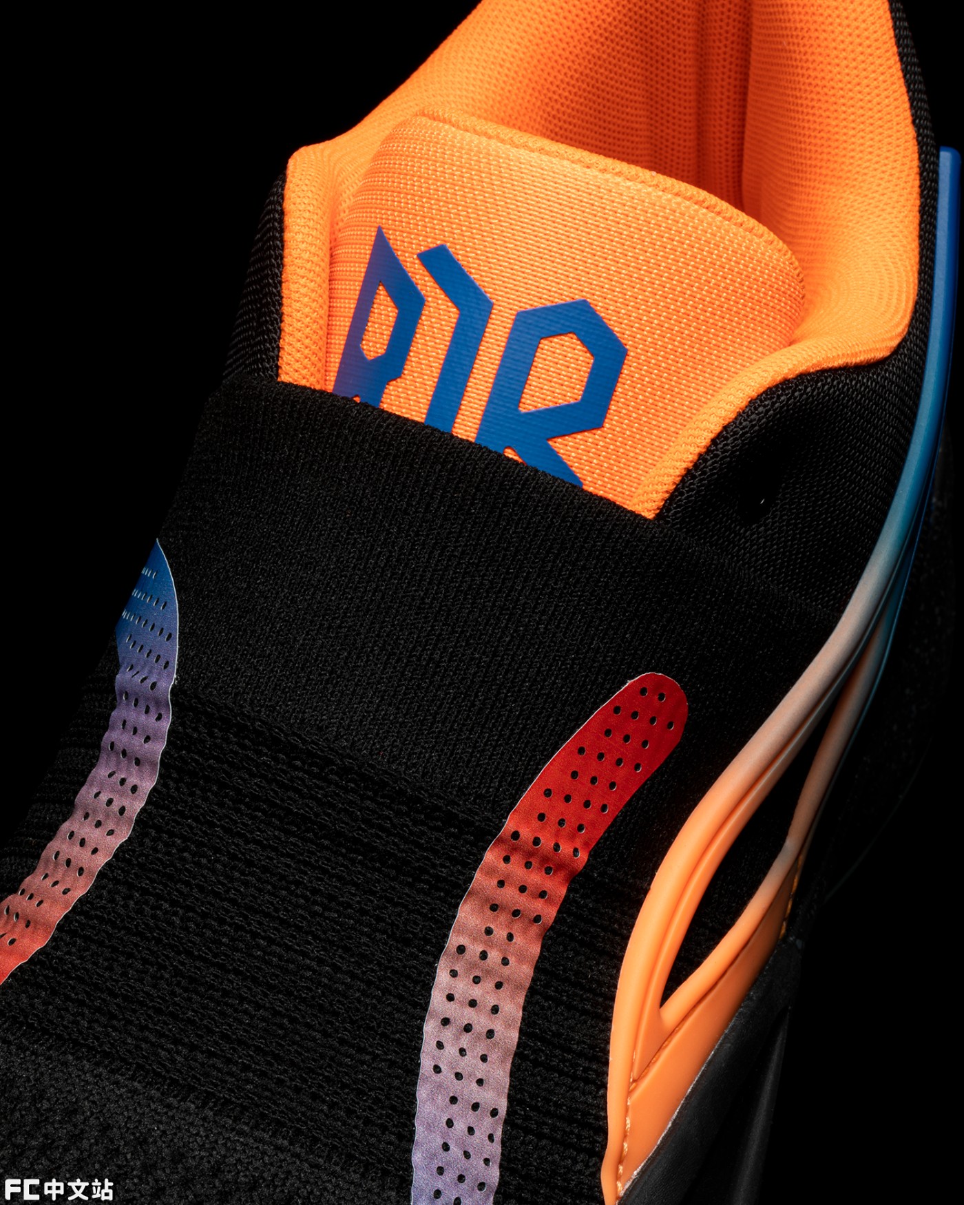 整双鞋采用大面积黑色,搭配蓝色到橙色渐变点缀,还原尼克斯球衣配色。