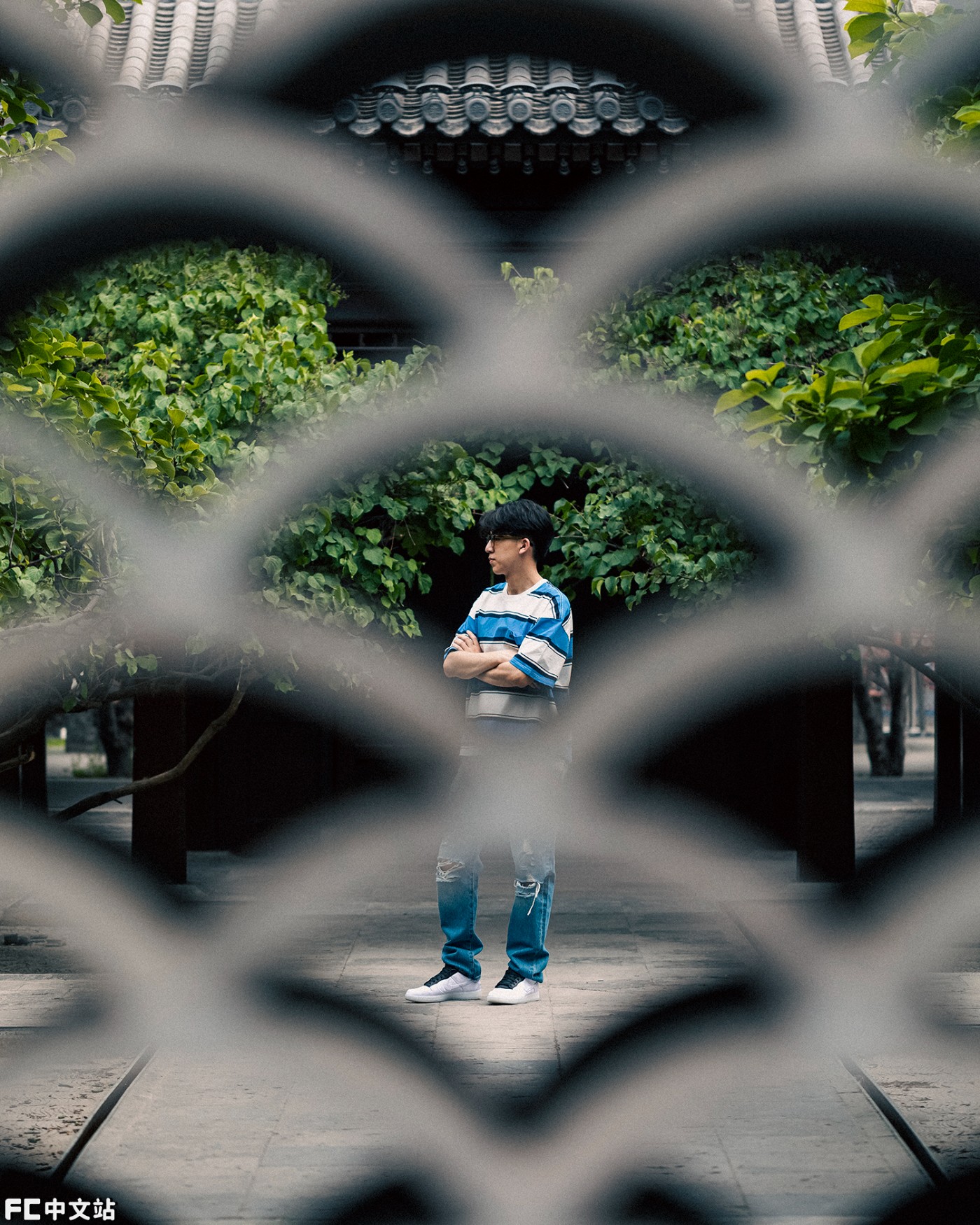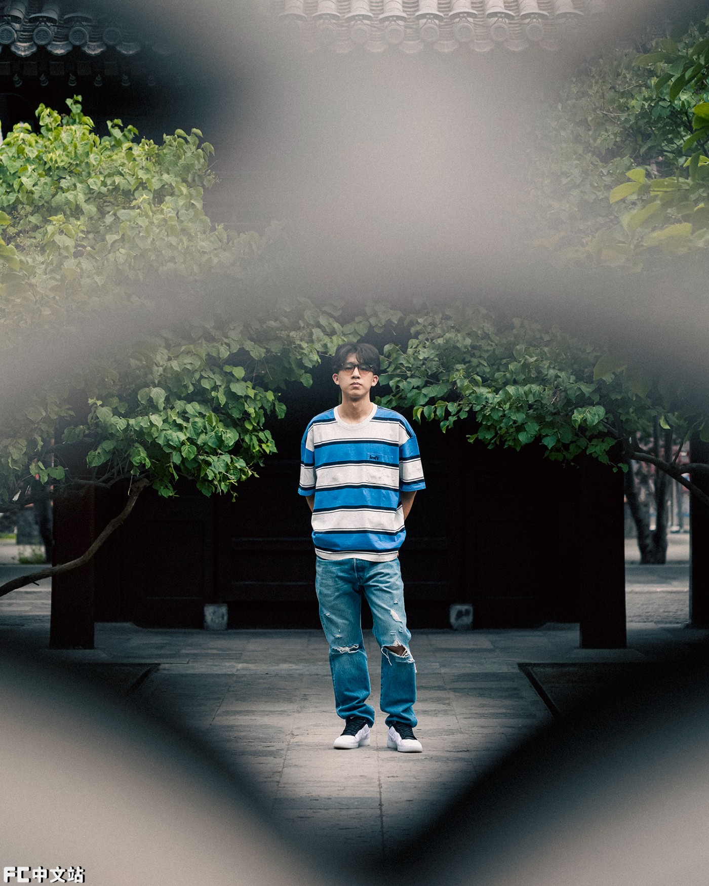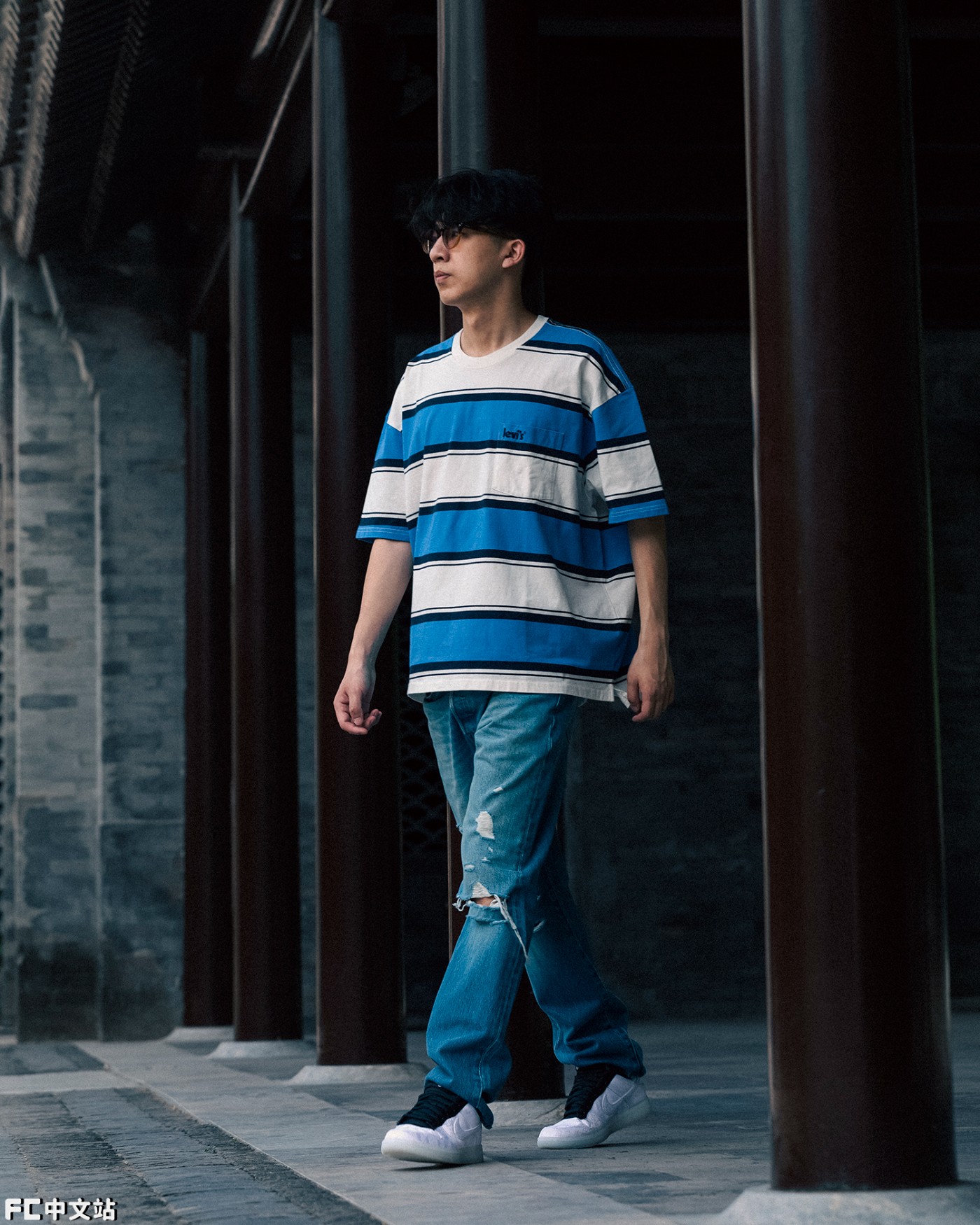 上半身则搭配一件 Levi's 蓝白条纹短袖 T 恤,妥妥的翻版冠希哥啊!