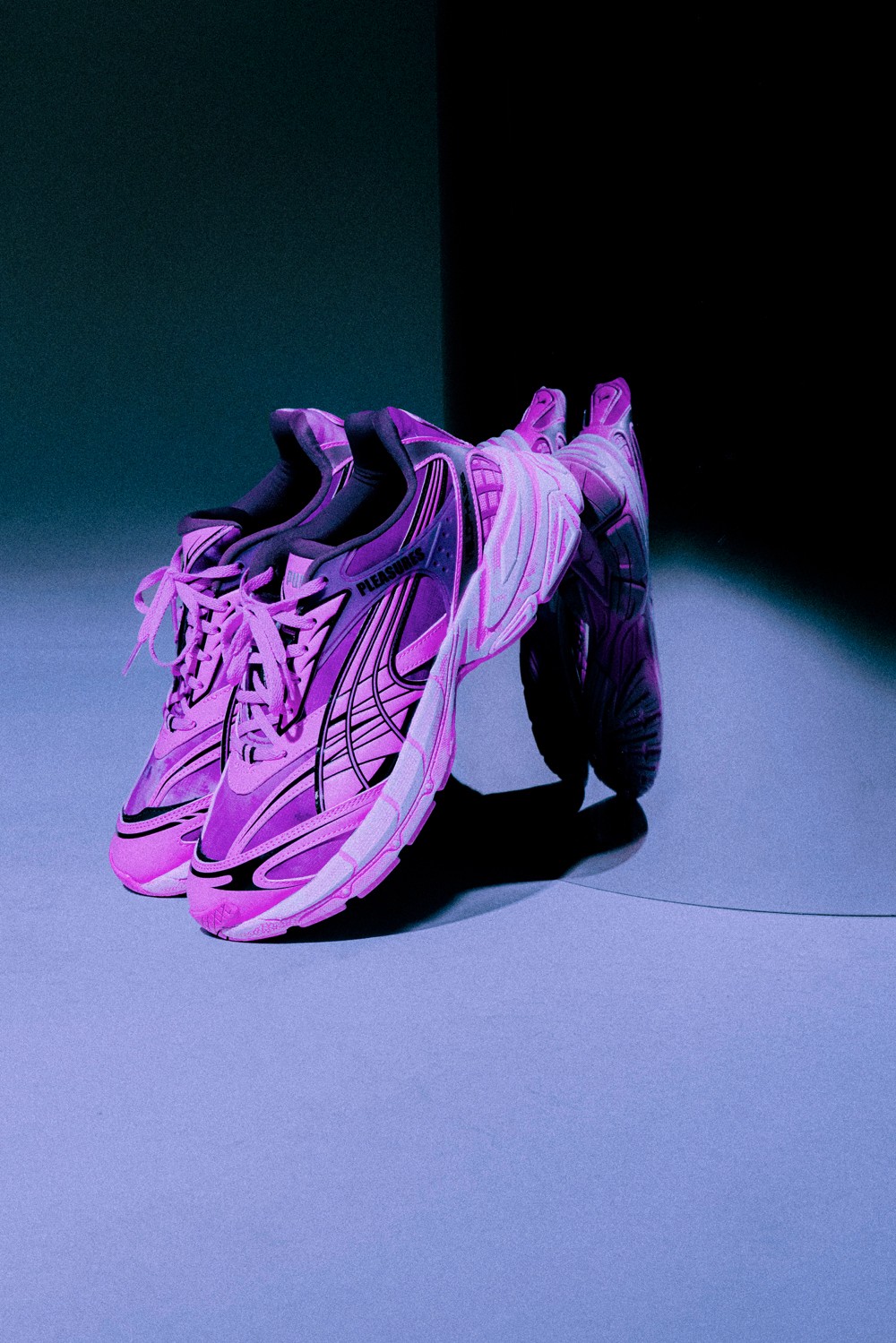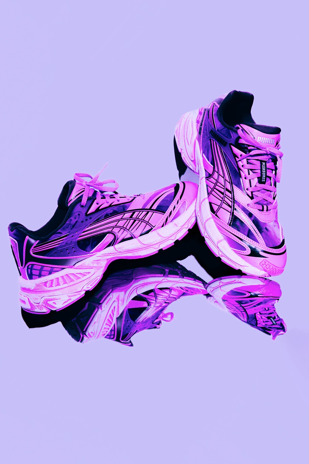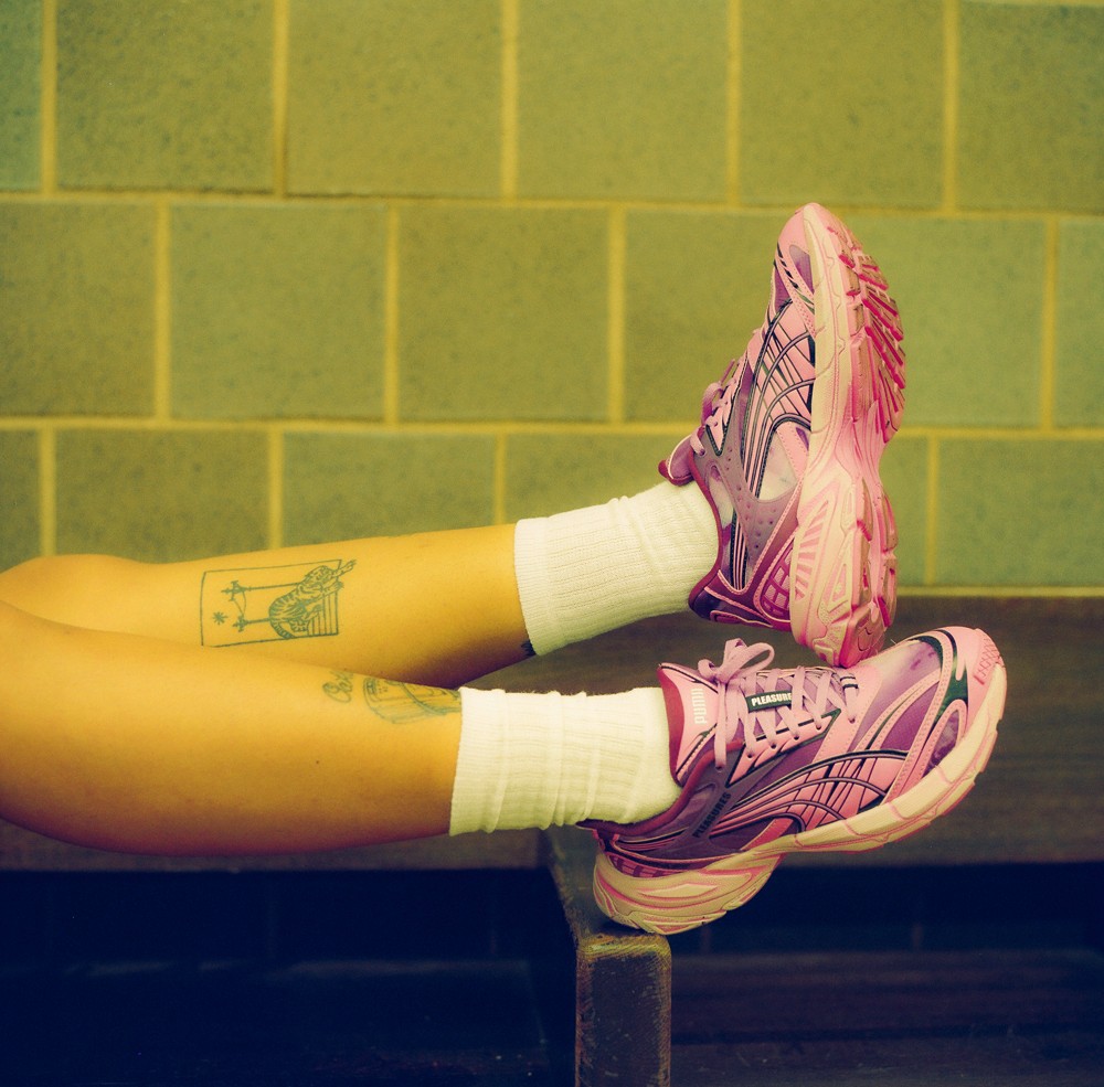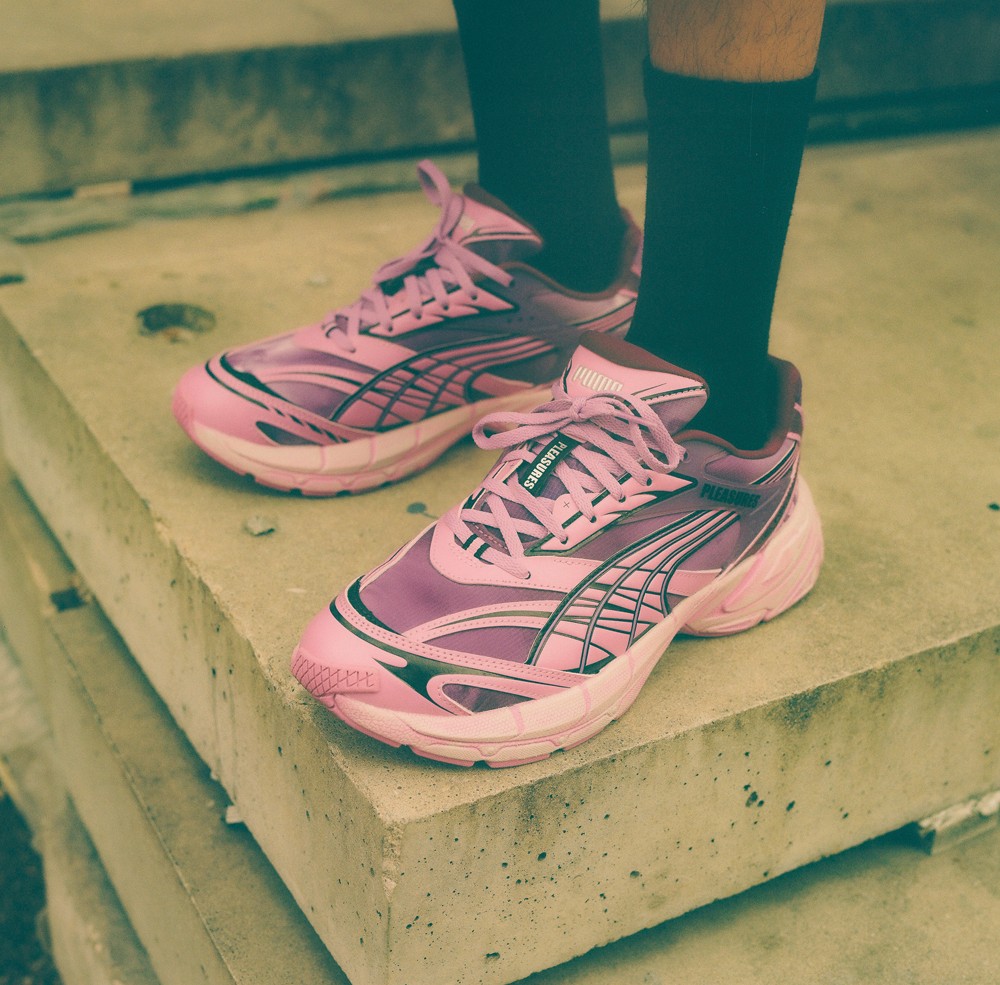 此次全新联名以 PUMA 的复古未来主义鞋型 Velophasis 为蓝本进行创作,并将 Pleasures 对音乐领域亚文化符号的理解融入其中。
