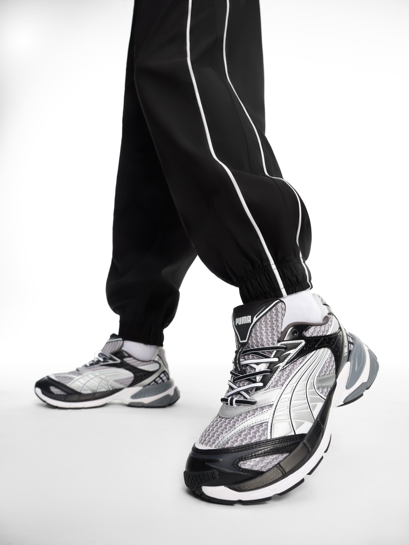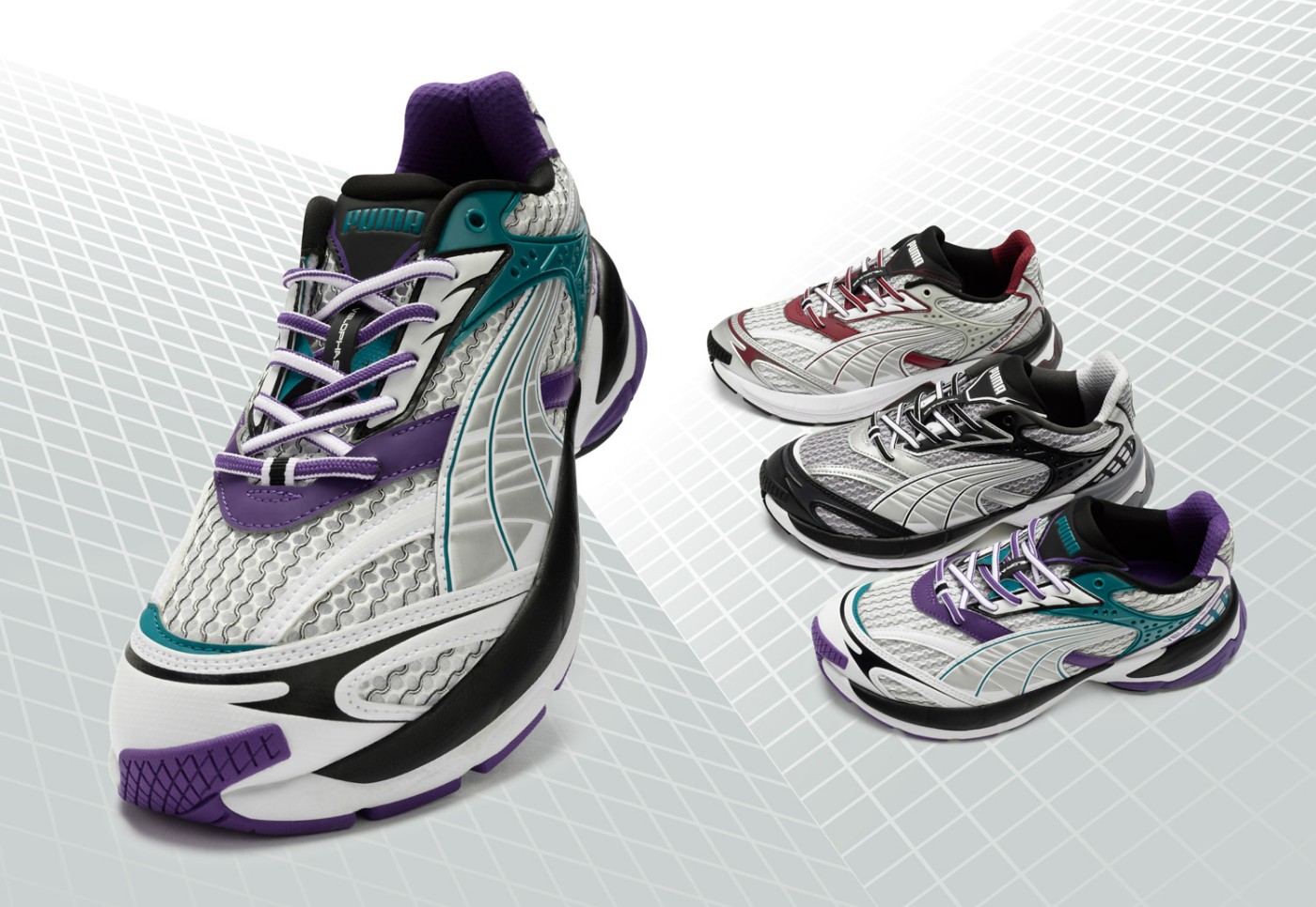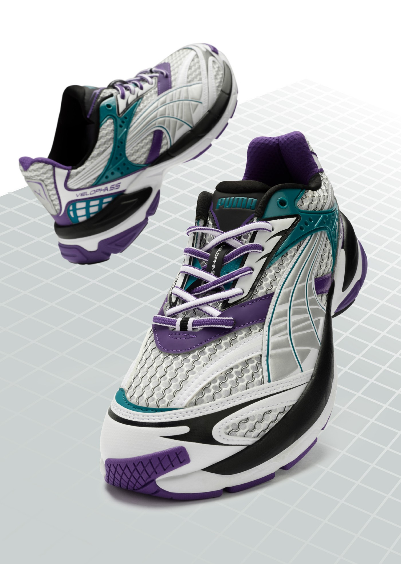 鞋款方面,以 PUMA Velophasis 鞋款为蓝本,鞋身采用大面积不规则的银色网眼设计。