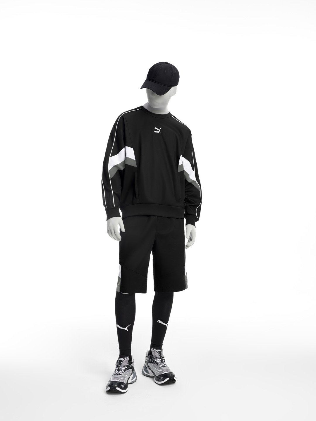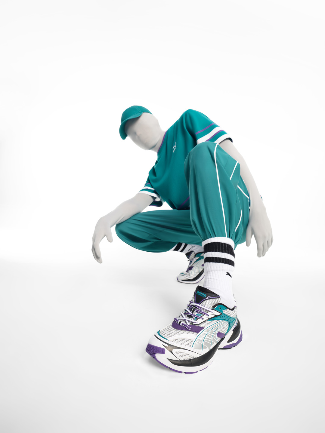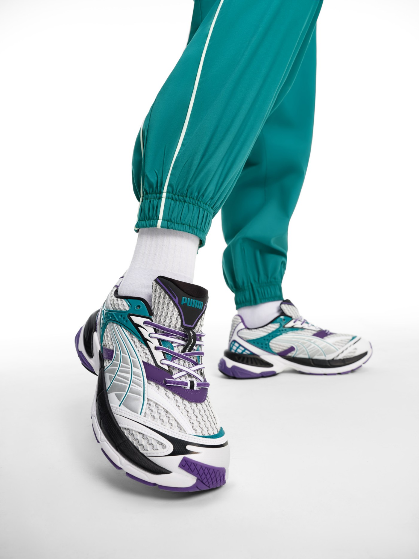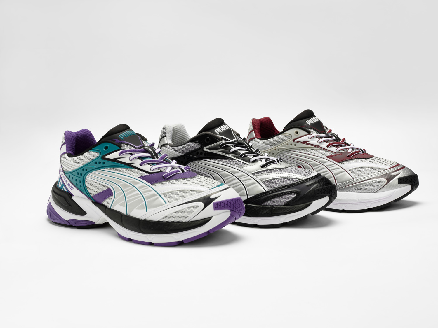 鞋款方面,以 PUMA Velophasis 鞋款为蓝本,鞋身采用大面积不规则的银色网眼设计。