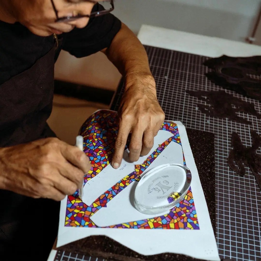 鞋身框架点缀彩色玻璃图案,与奢华的意大利皮质形成鲜明对比。