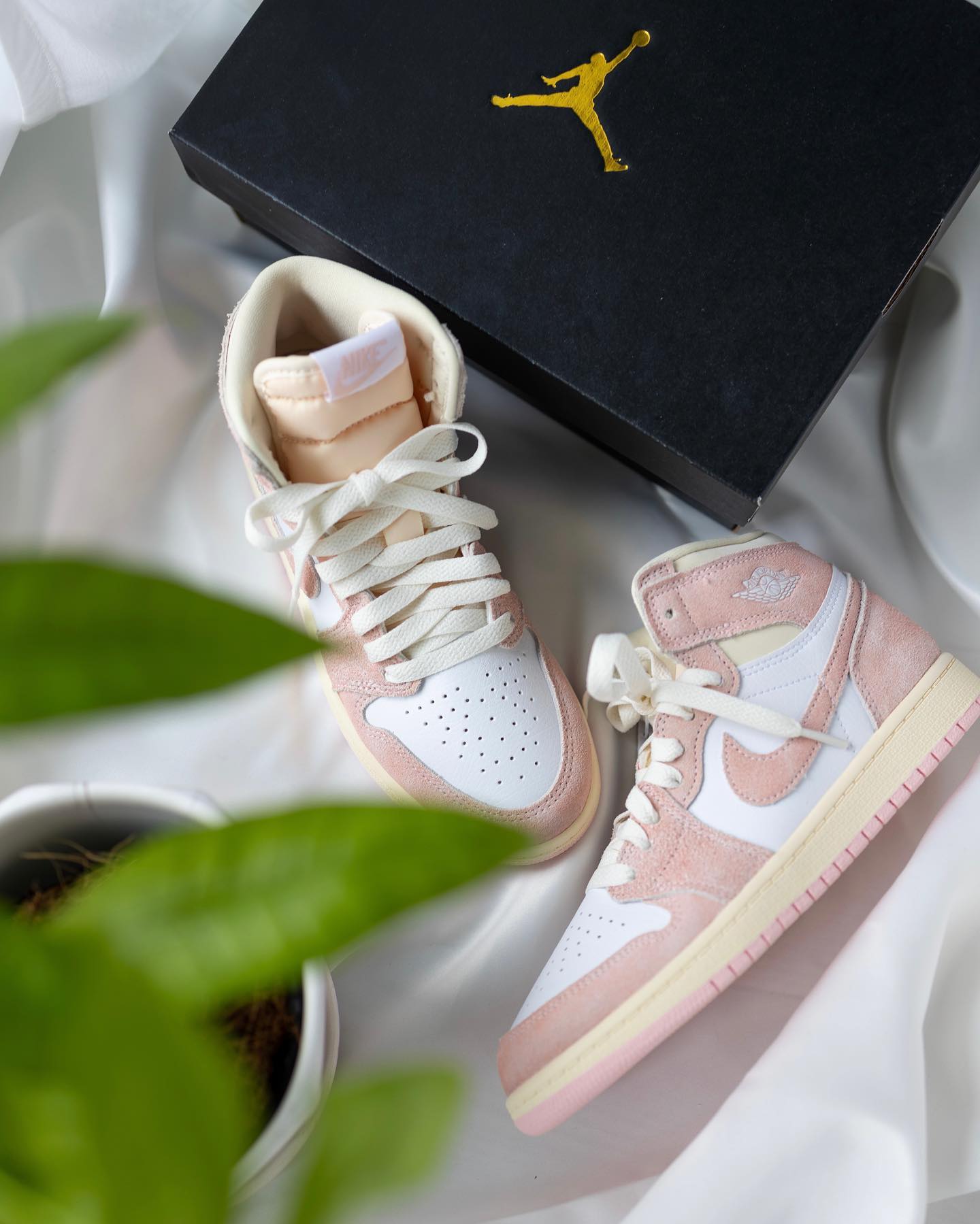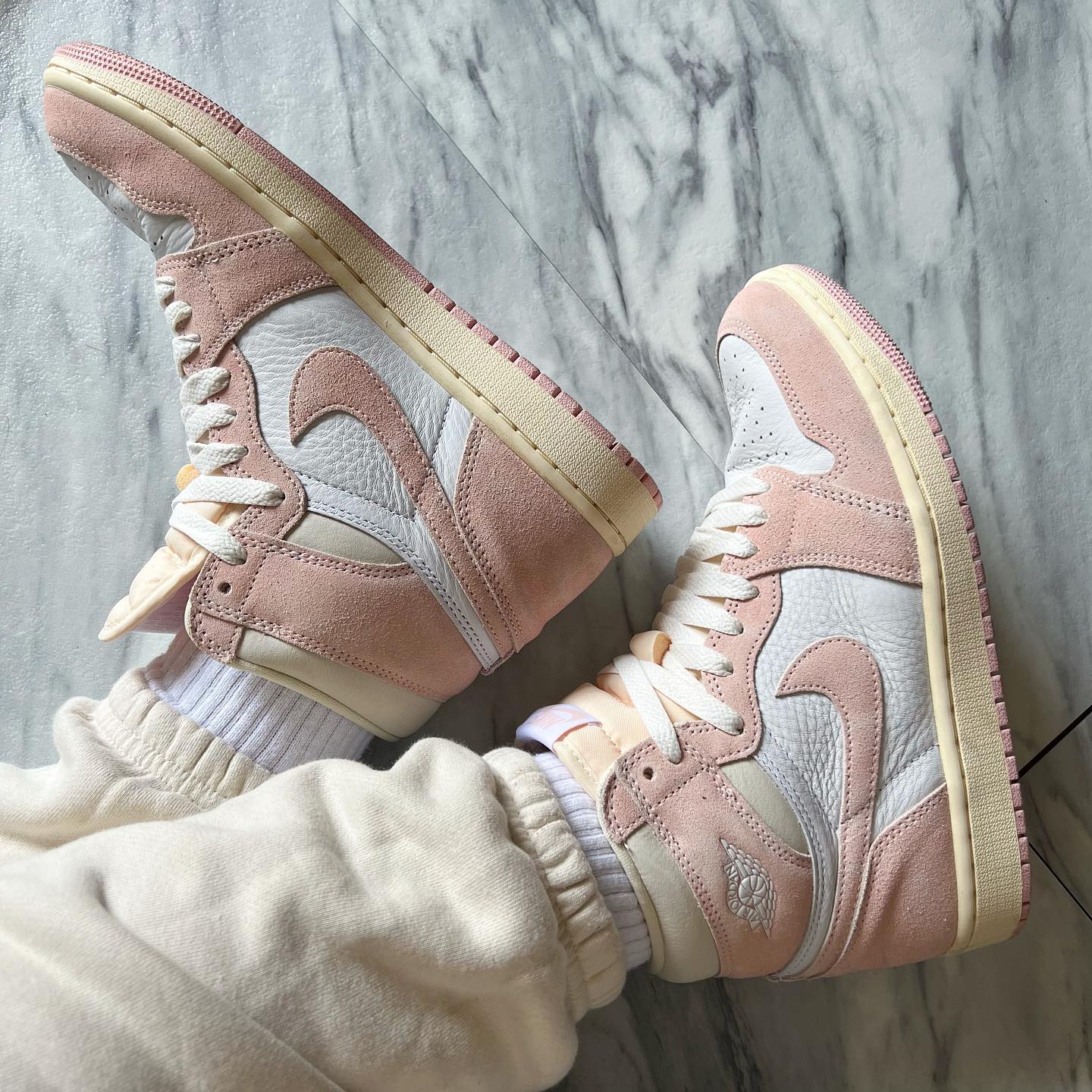 这双前阵子刚发的 Air Jordan 1,鞋面以水洗风格的粉色麂皮包裹,非常适合炎炎夏日的清爽穿搭。