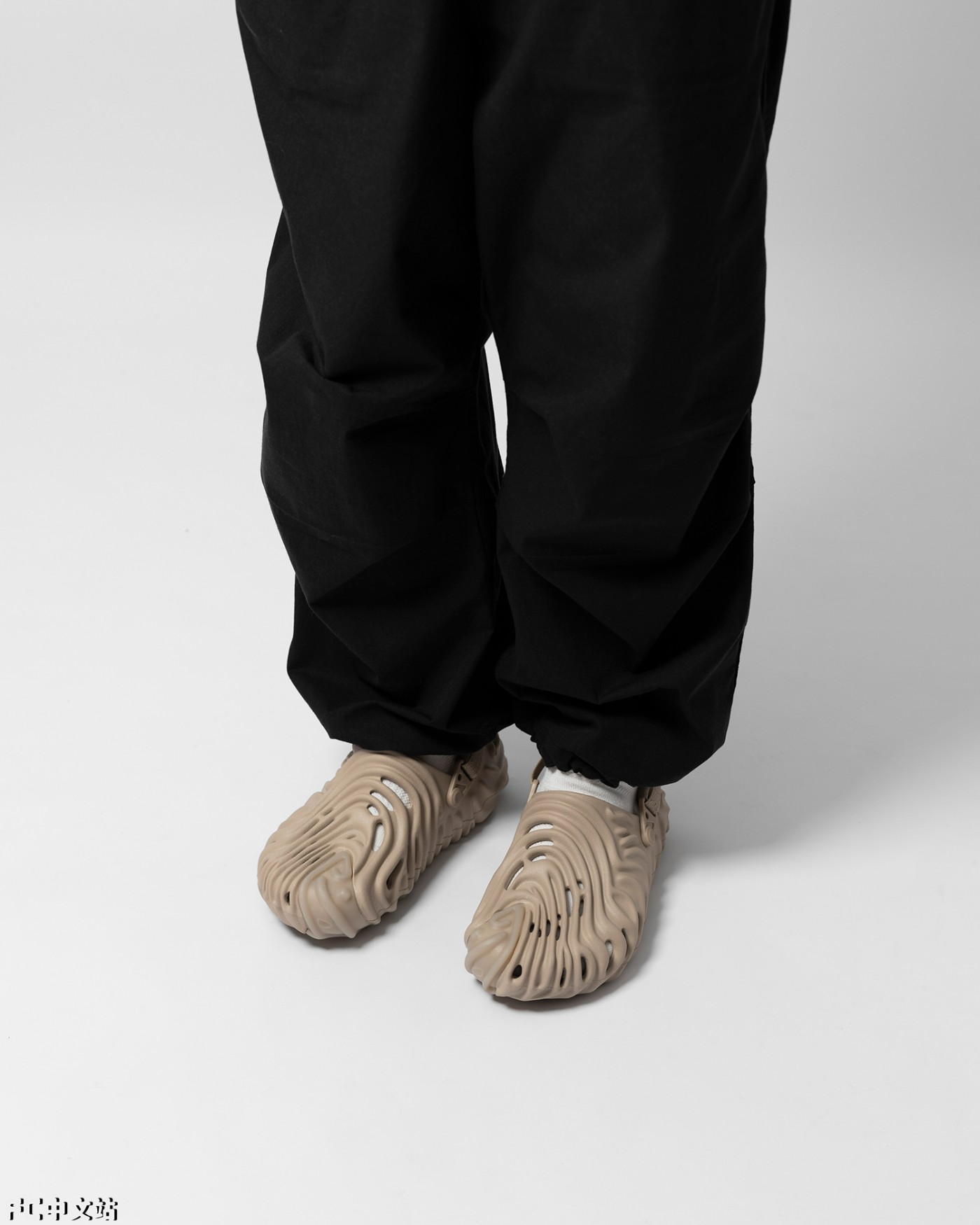 来到上脚环节,小编选择一条伞兵裤搭配,收腿版型完整展现出洞洞鞋轮廓。