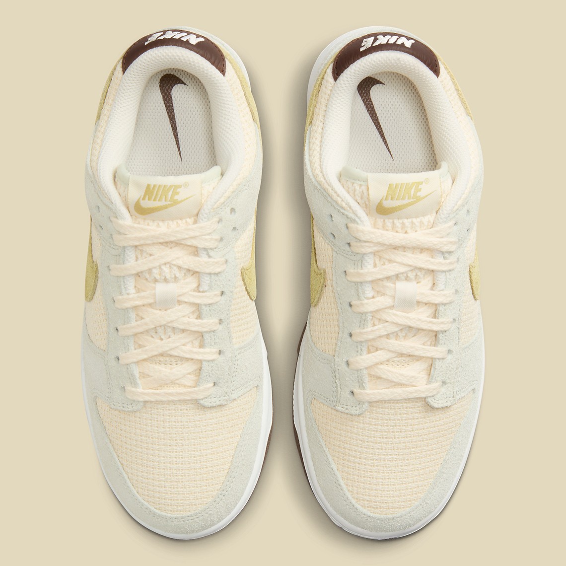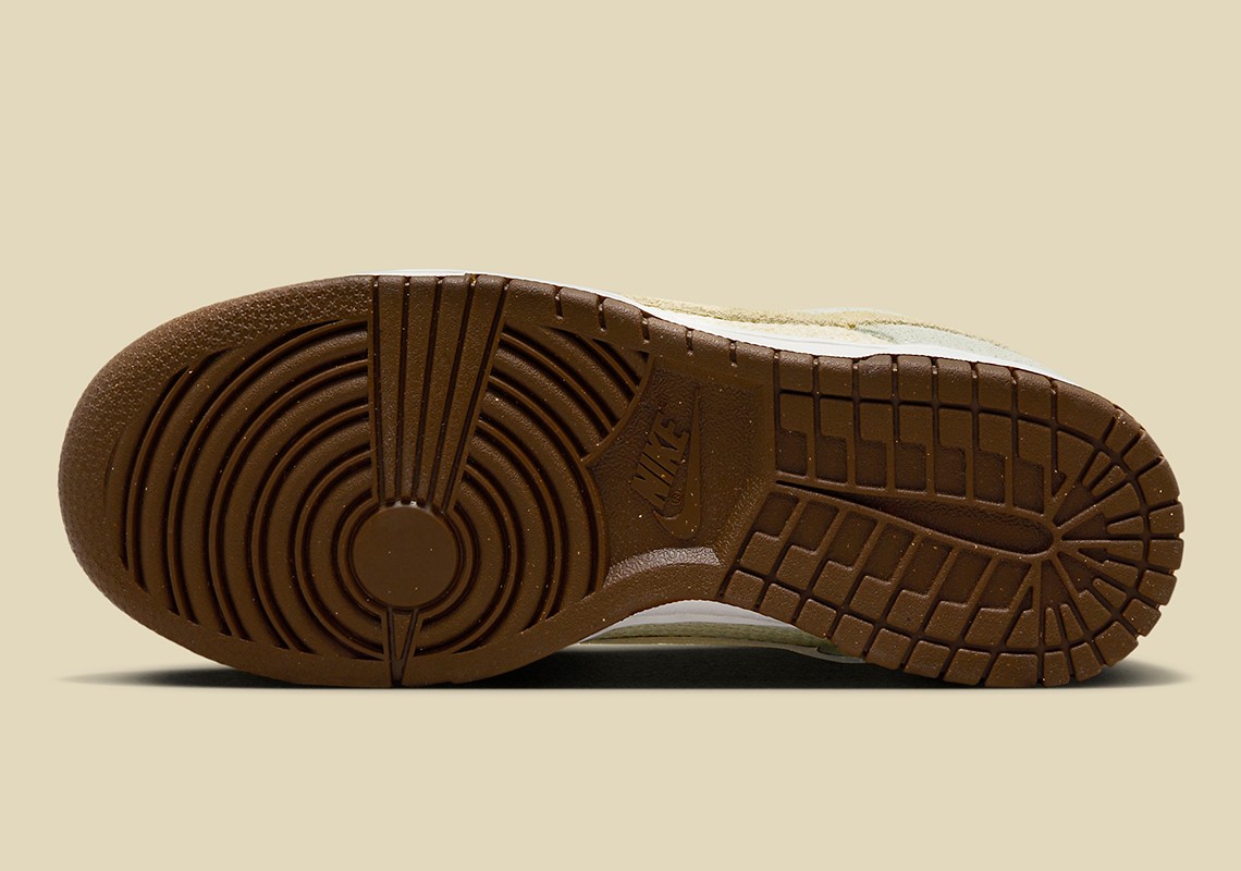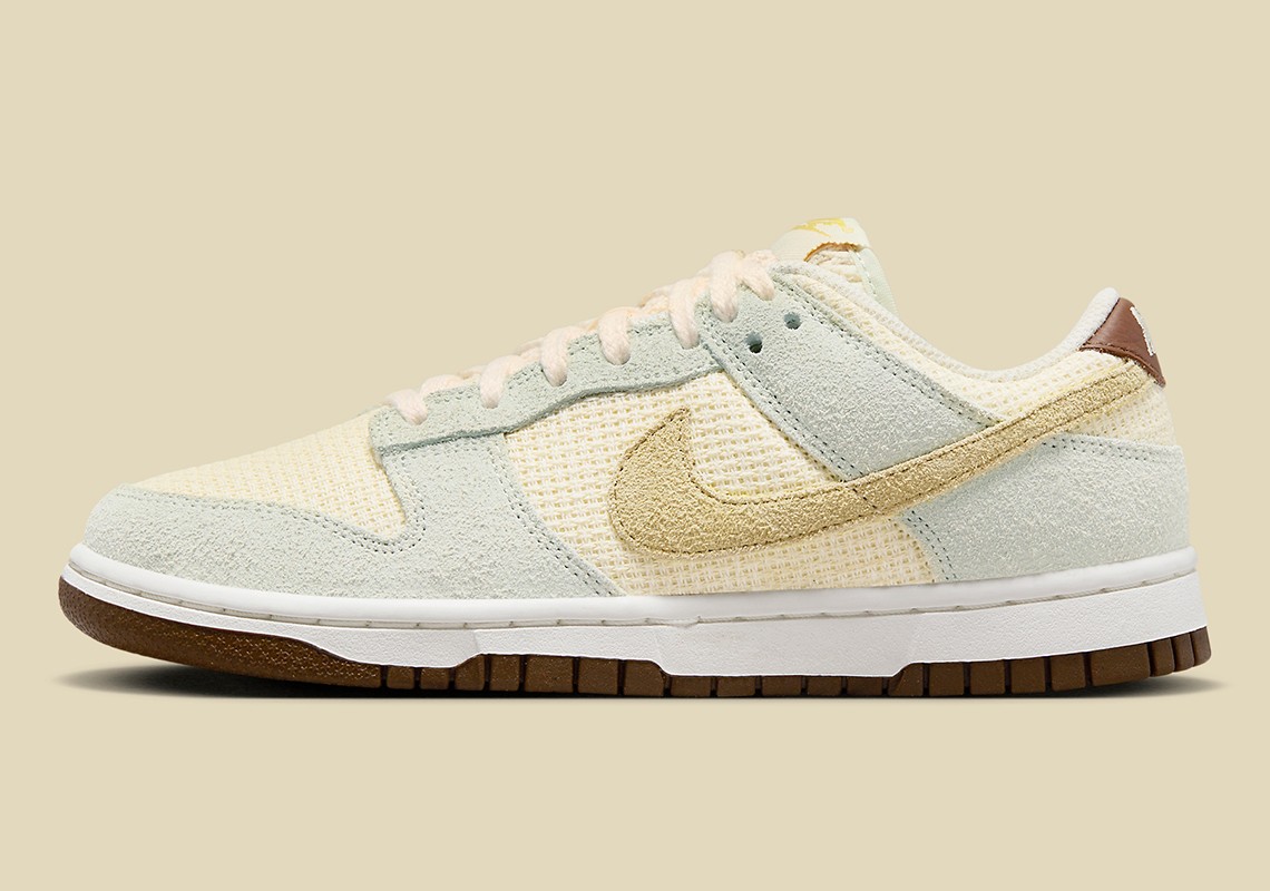 整双鞋采用大面积淡黄色为主色,以棕和淡绿点缀,造型相当讨喜,带来清爽百搭的效果。