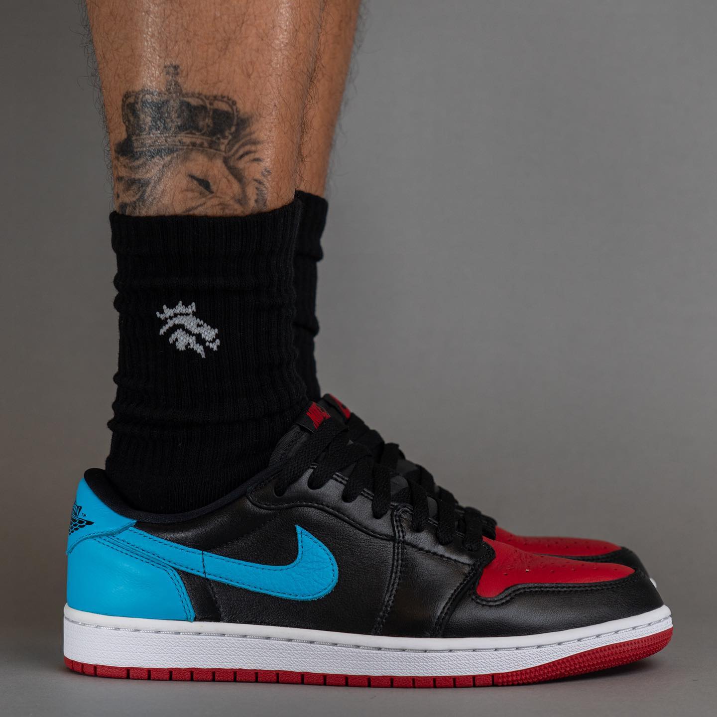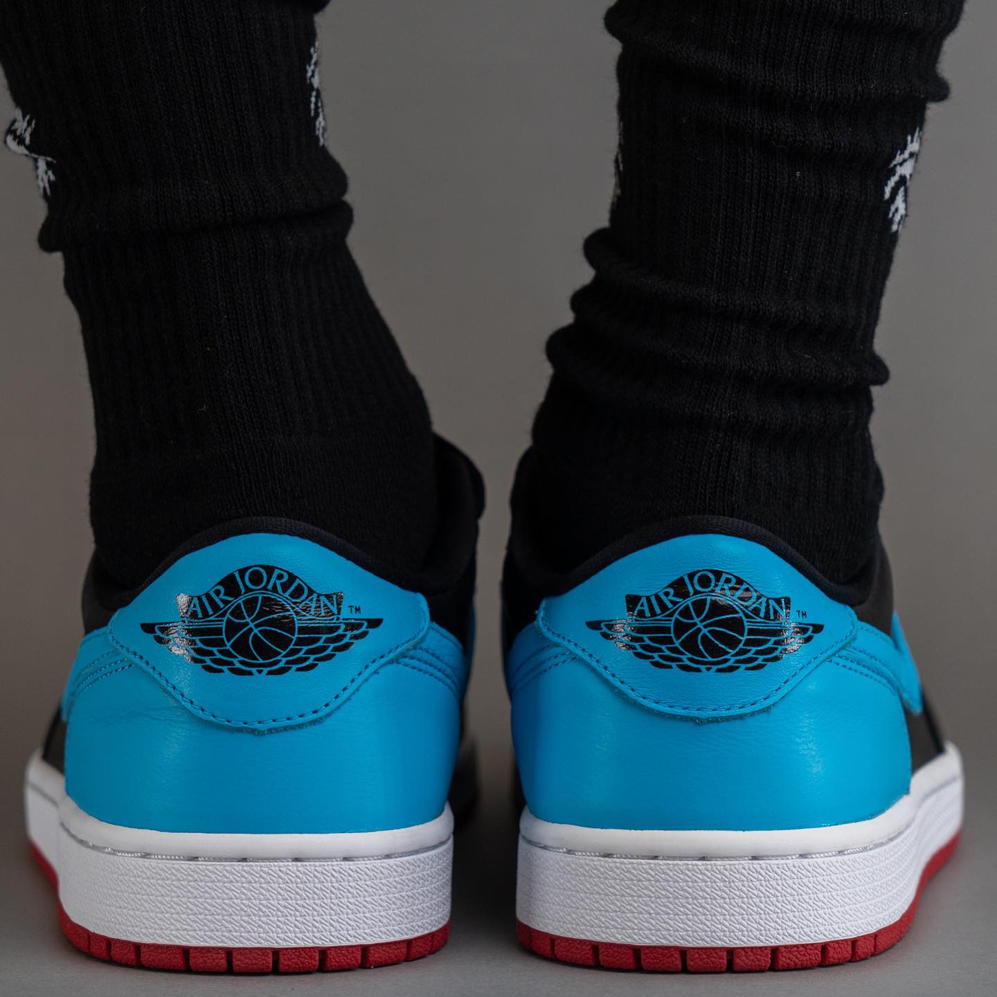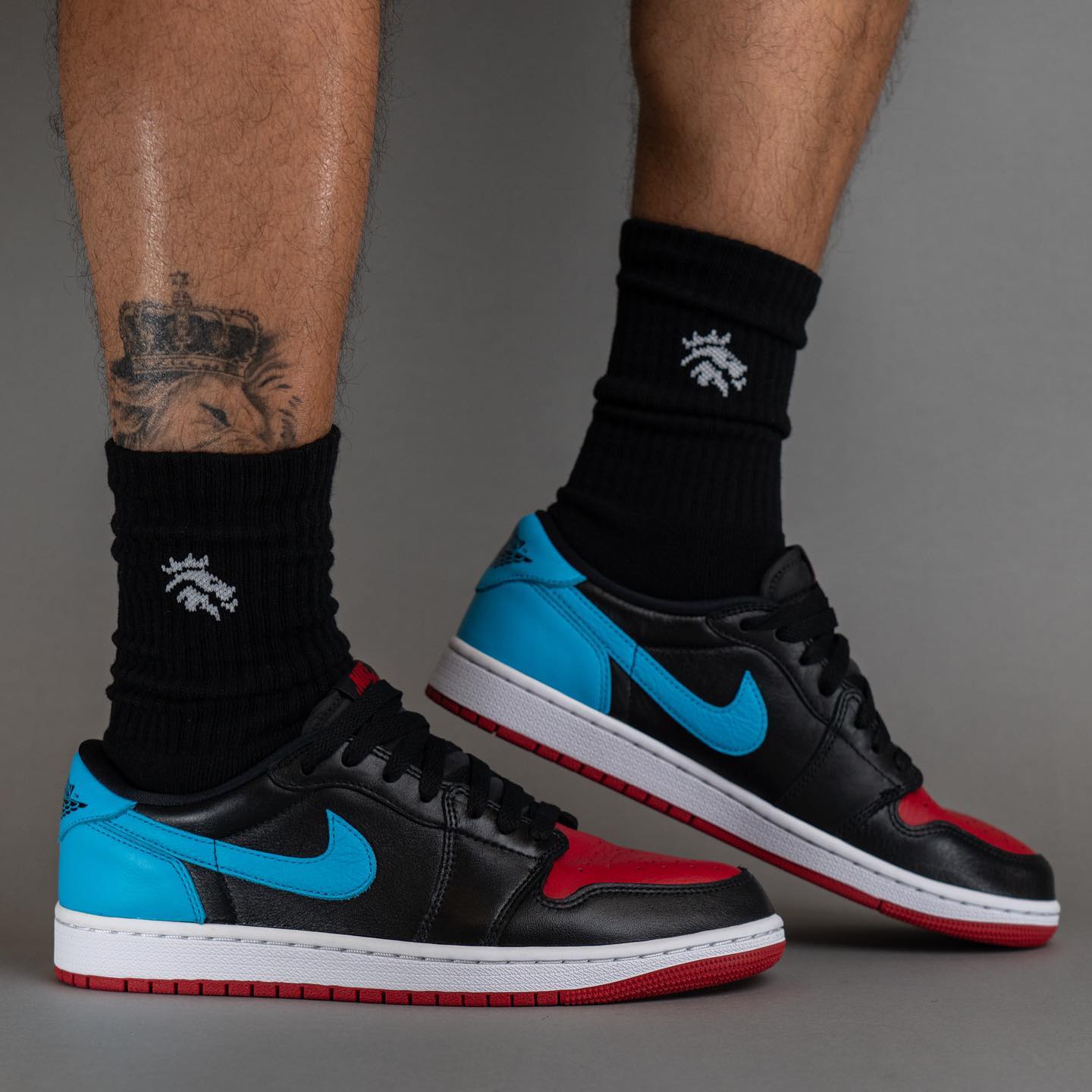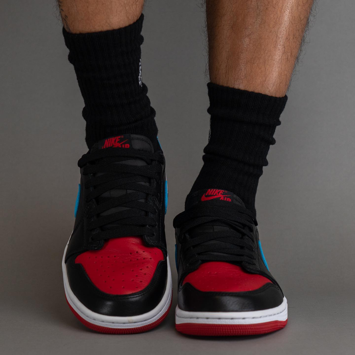 整双鞋采用黑色为主调,辅以红、蓝点缀,一次性将「禁穿」和「北卡」配色呈现,视觉效果格外讨喜。