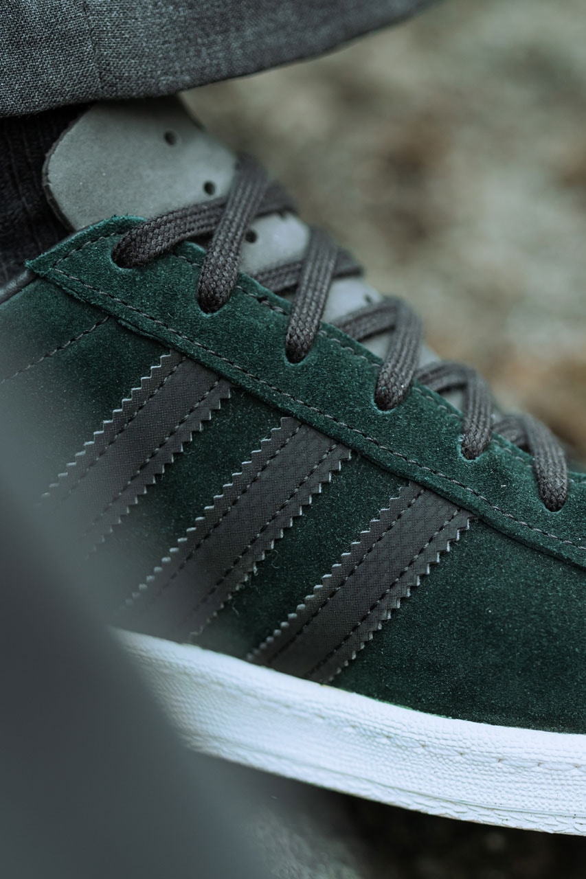 第一双 Campus 80 设计非常经典,鞋面、侧面和后跟处均有深绿色细节装饰。