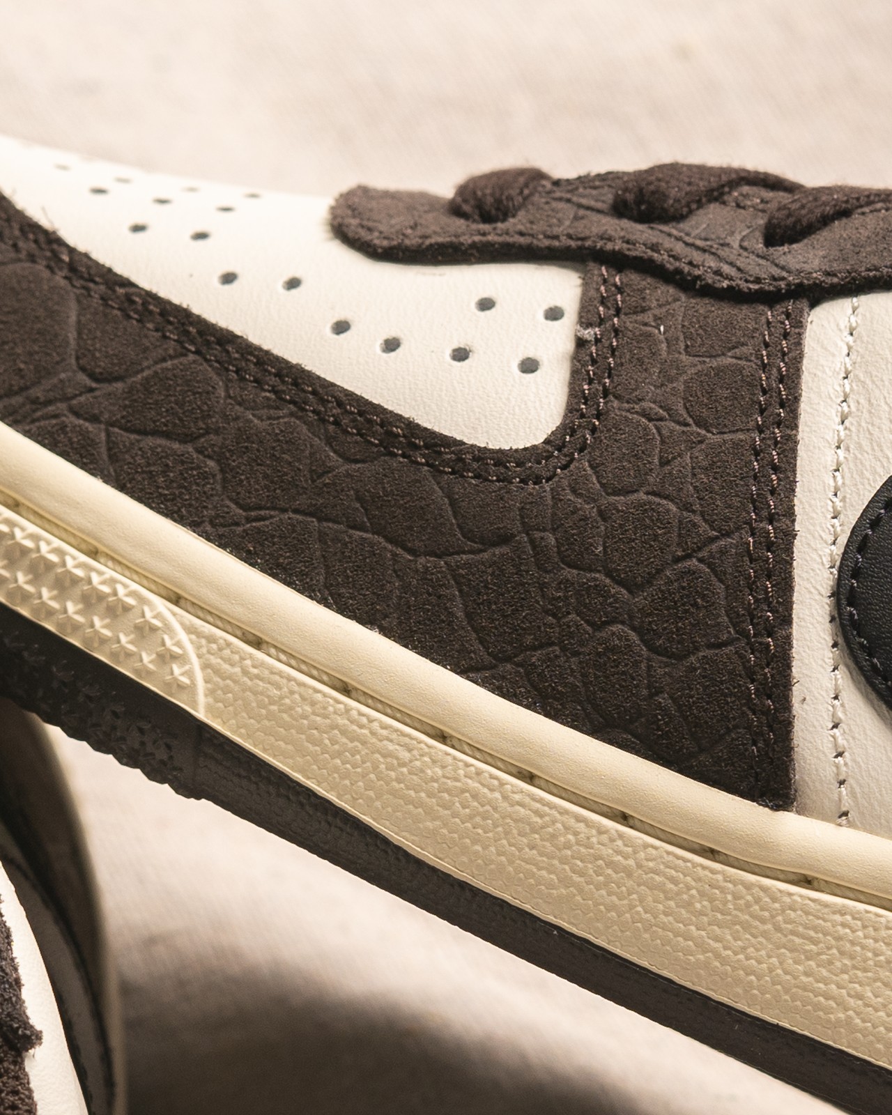 同时在棕色麂皮上有龟裂设计。