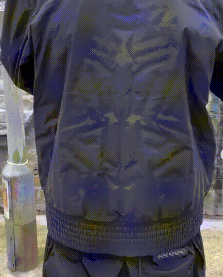 平时看起来就像一件普通的软壳夹克,但可以通过向衣领的气阀充气来调节内胆,提升衣物的保暖性能。