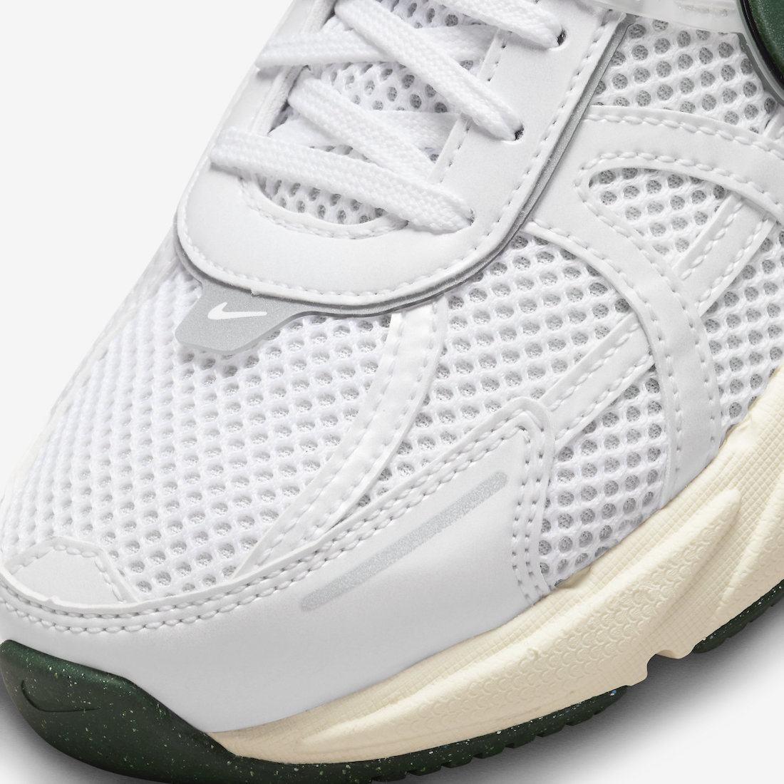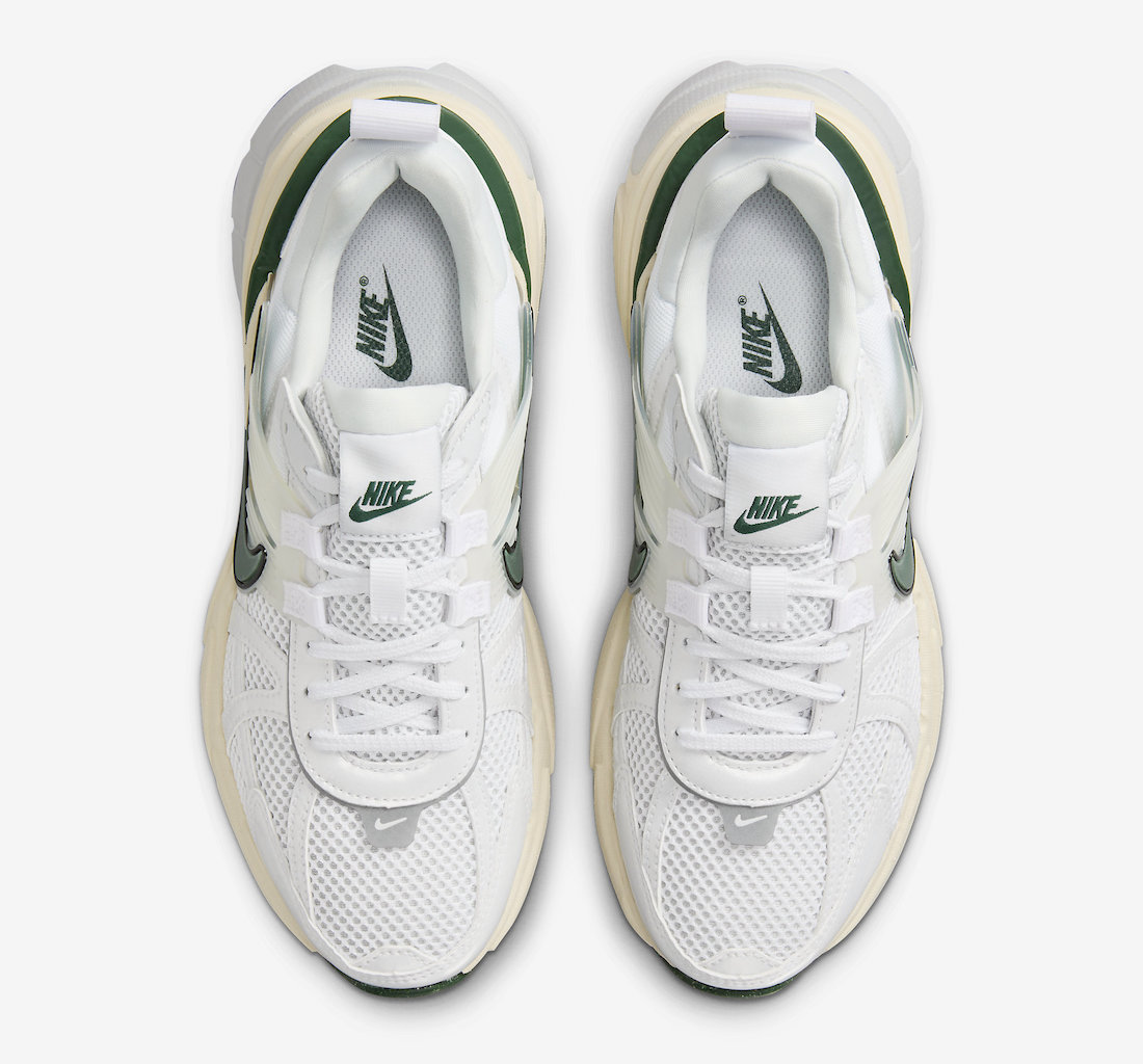 整双鞋以纯白与氧化色示人,辅以绿色细节点缀,经典的复古白绿色调。
