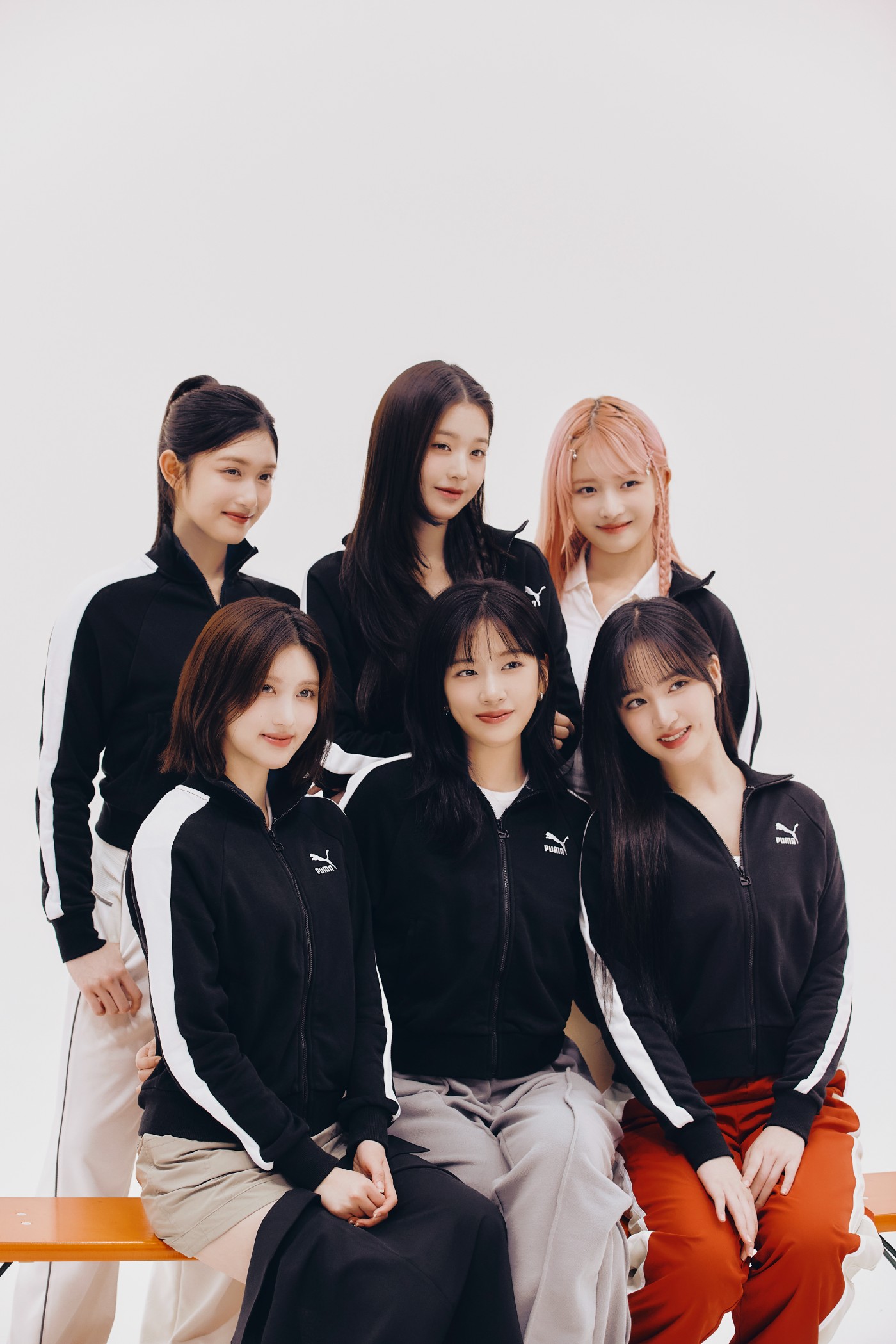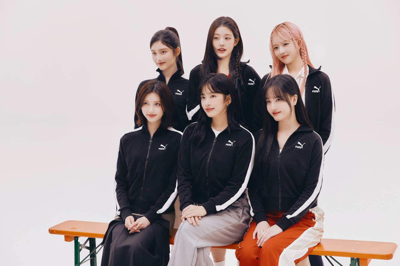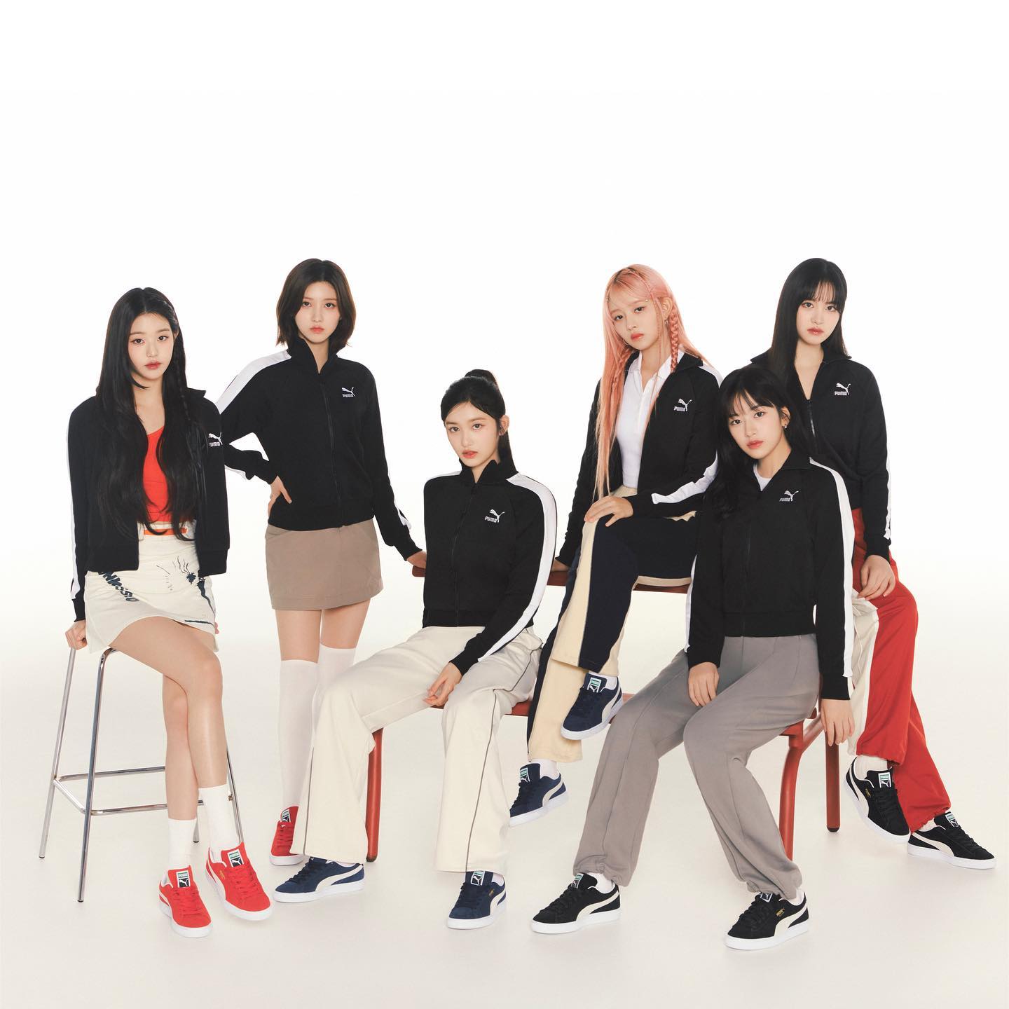 六位成员身穿 PUMA 经典 T7 夹克和 Suede 鞋款,甜美形象完美地演绎了这两款基础单品的魅力之处。