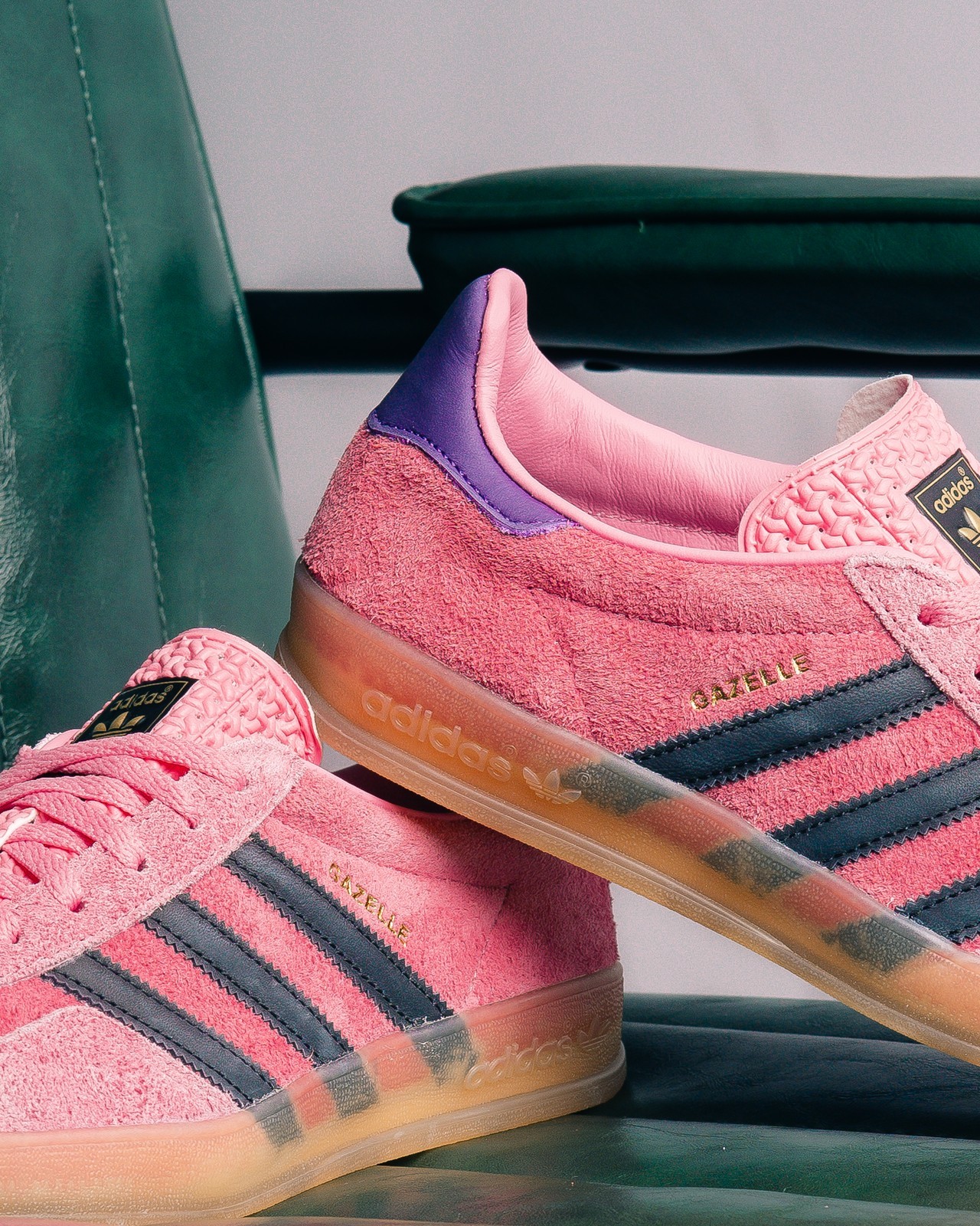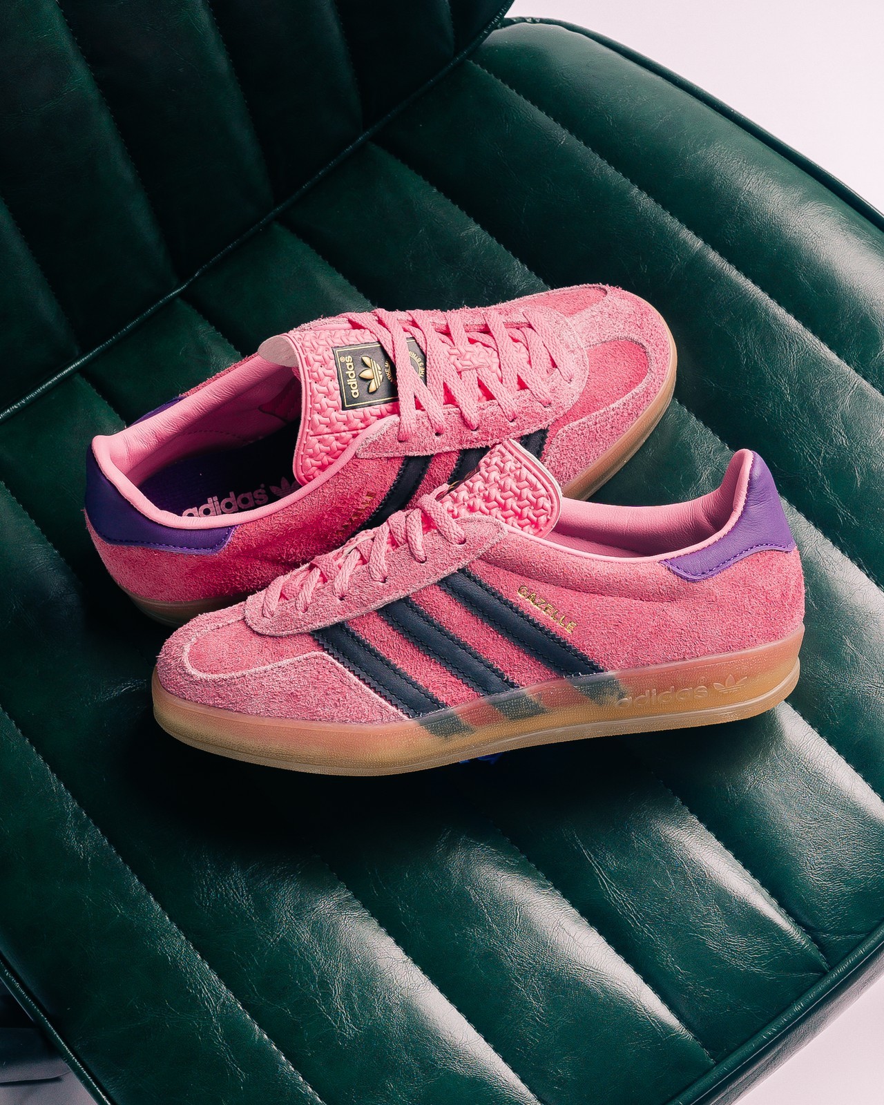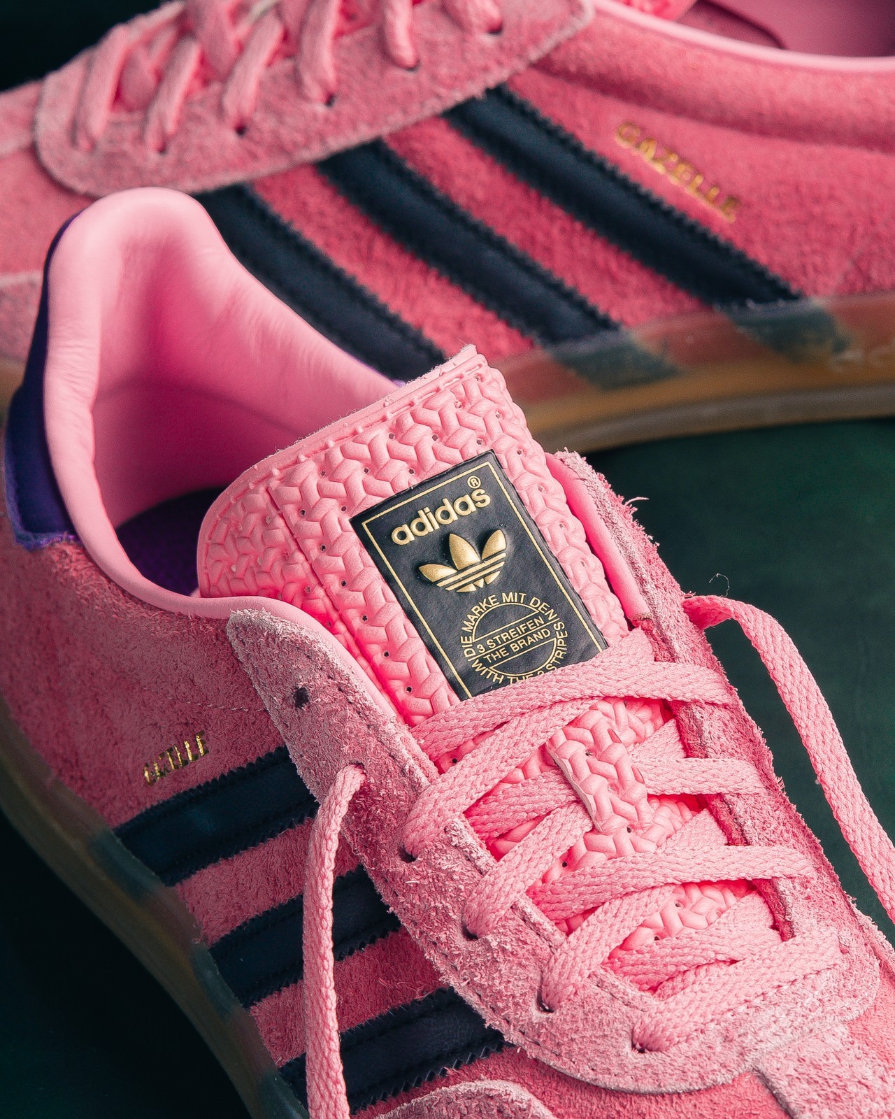 第二双 Gazelle 采用大面积粉色打造,辅以黑色与紫色点缀,有一种 Gucci x adidas Gazelle “Pink” 的既视感。