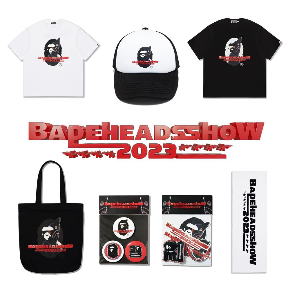 由经典标识「猿人头」、艺术象征「鲨星人」以及主题字样「BAPE HEADS SHOW 2023」三大元素合体的 Logo 贯穿全系列。