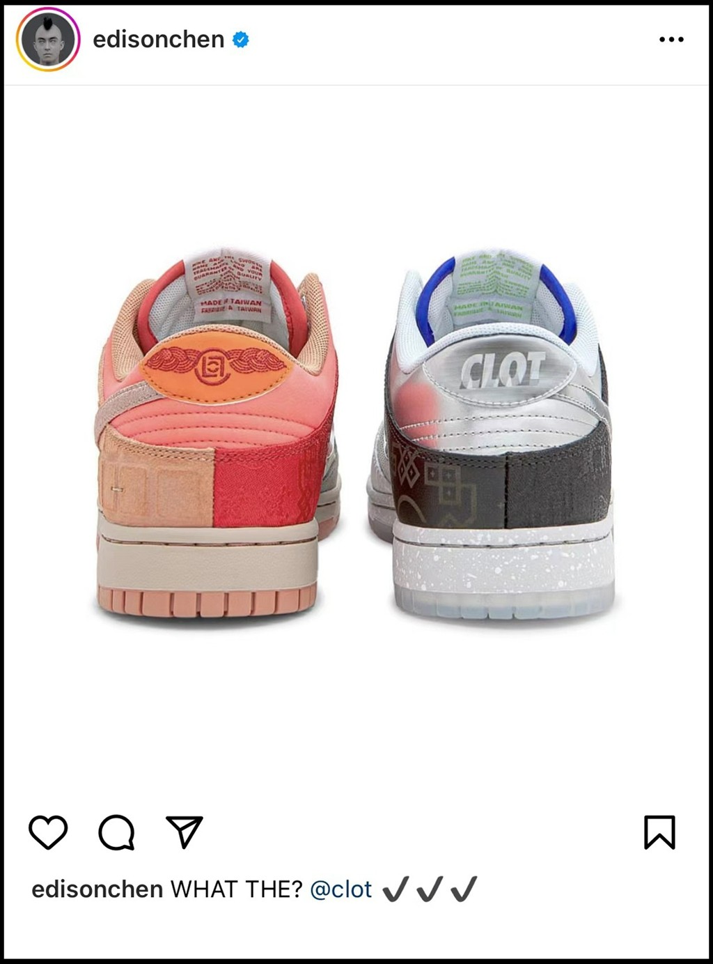 结果冠希本人就在传闻流出后,亲自晒出了 Nike Dunk Low “What The CLOT”,似乎暗示了消息的真实性……也就是说 Nike Dunk Low “What The CLOT” 有很大概率是冠希在 Nike 的 “最后一舞”。