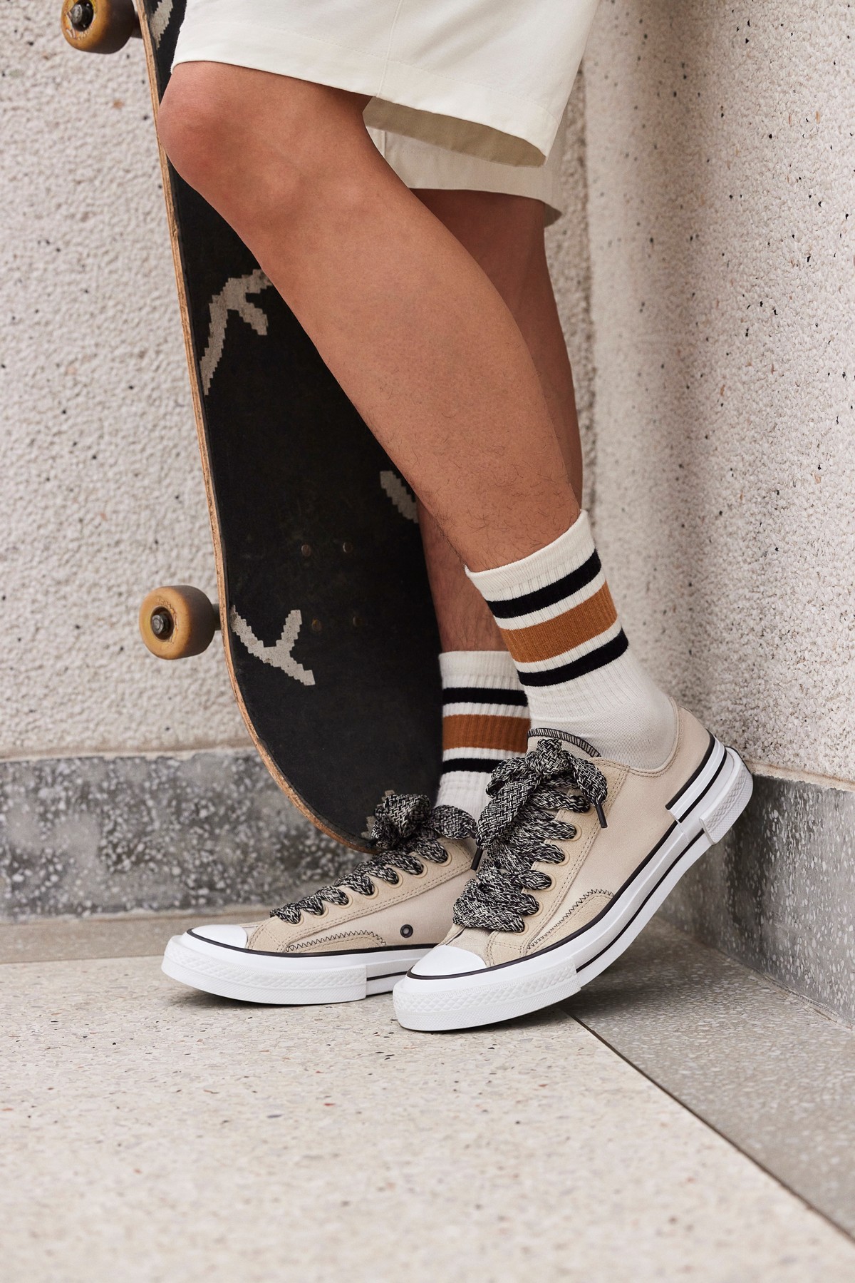 Converse Chuck 70 则以一高一低示人,高帮采用黑色与白色组成,造型格外低调。