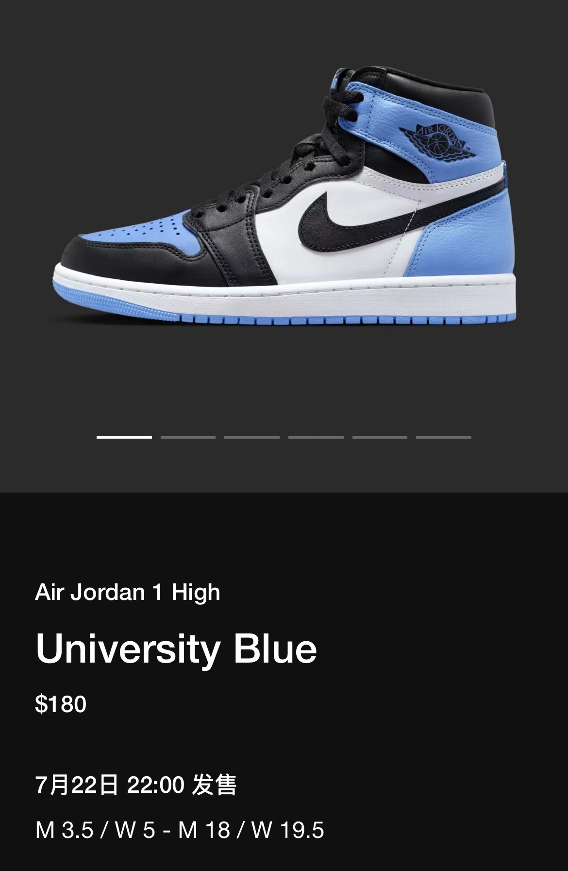 目前,全新的 Air Jordan 1 Hi“University Blue” 现已上架美区 SNKRS APP,并预计将于 7 月 22 日迎来更大范围市售,价格为 $180 美元。