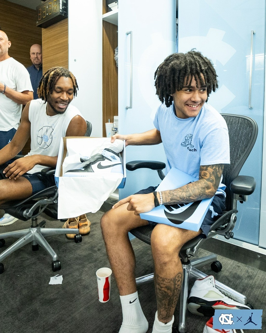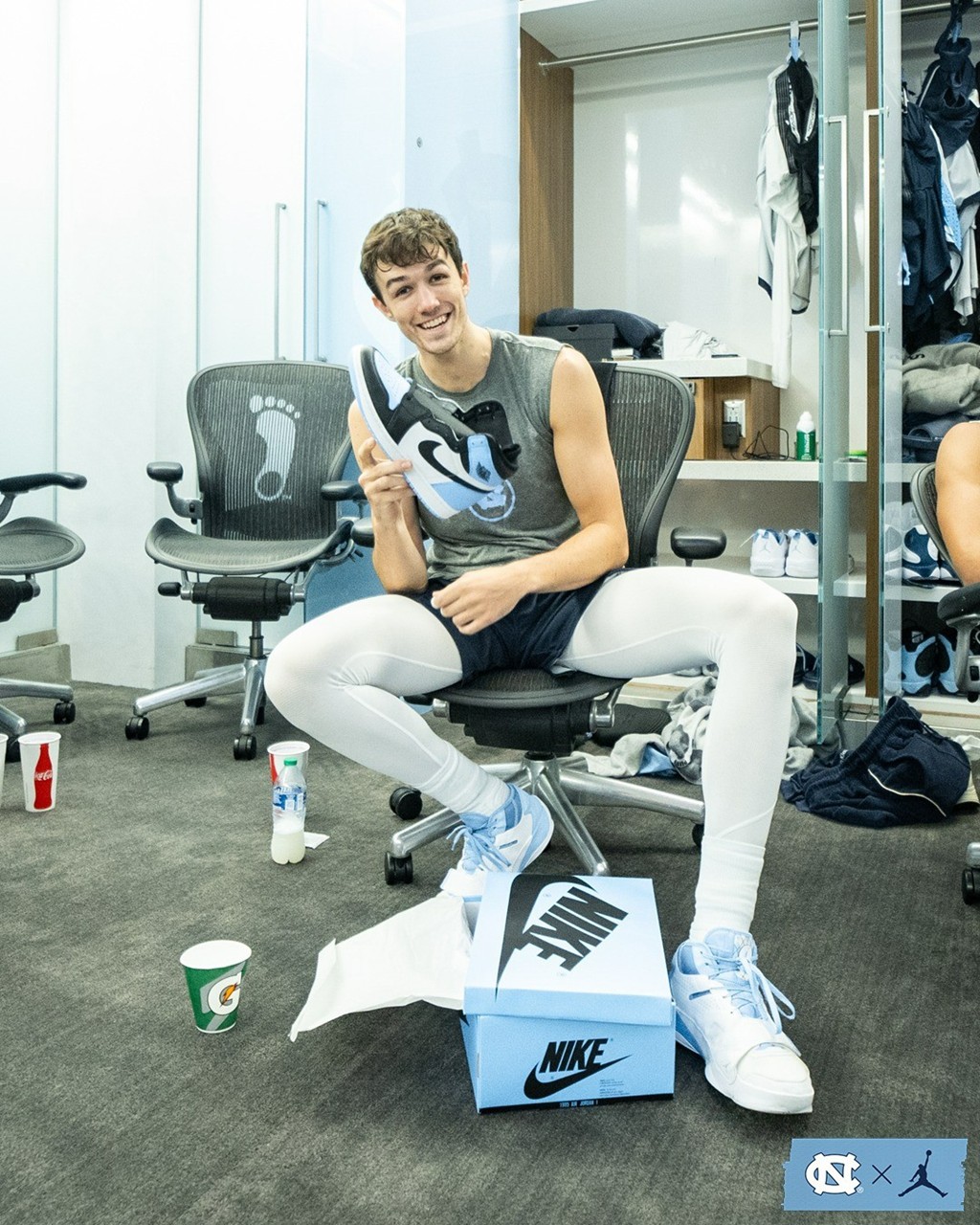 而且,本次北卡男篮球员们也在前几天收到了老学长迈克尔·乔丹送来的这双「北卡蓝黑脚趾」Air Jordan 1,使得这双鞋又有了一层 “大学 PE” 的标签。