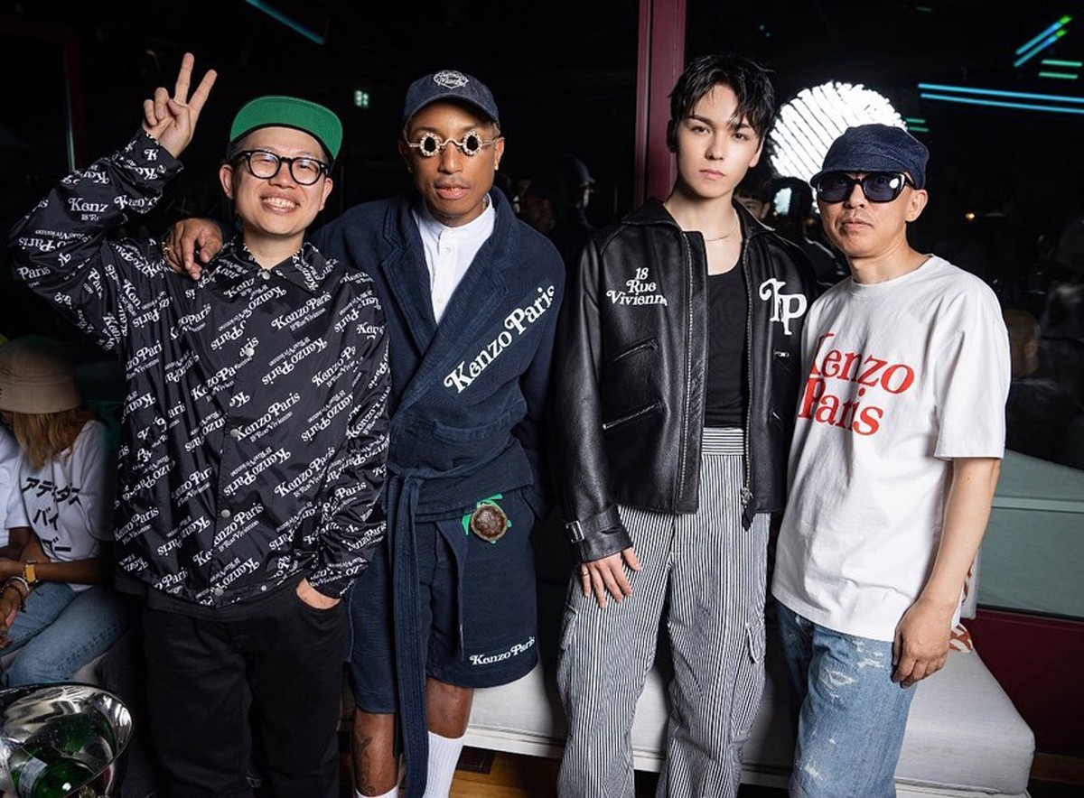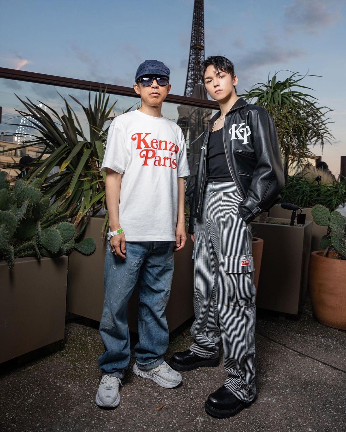 秀场上菲董也是超给面子的穿上了 KENZO 最新一季单品,而 NIGO®️ 则是非常朴素的一件 KENZO 印花白 T、牛仔裤以及一双银灰色复古运动鞋,为自己的东家带货。
