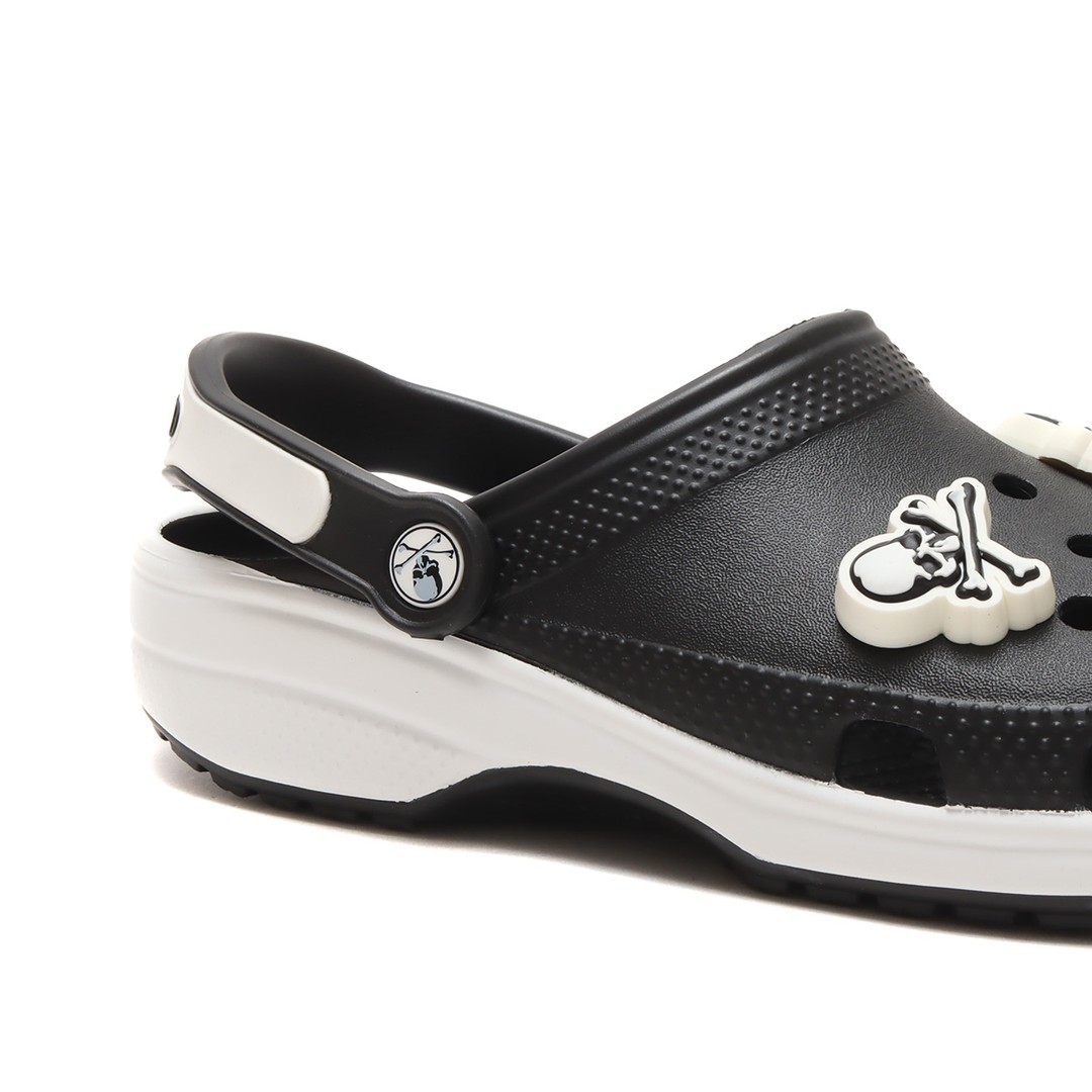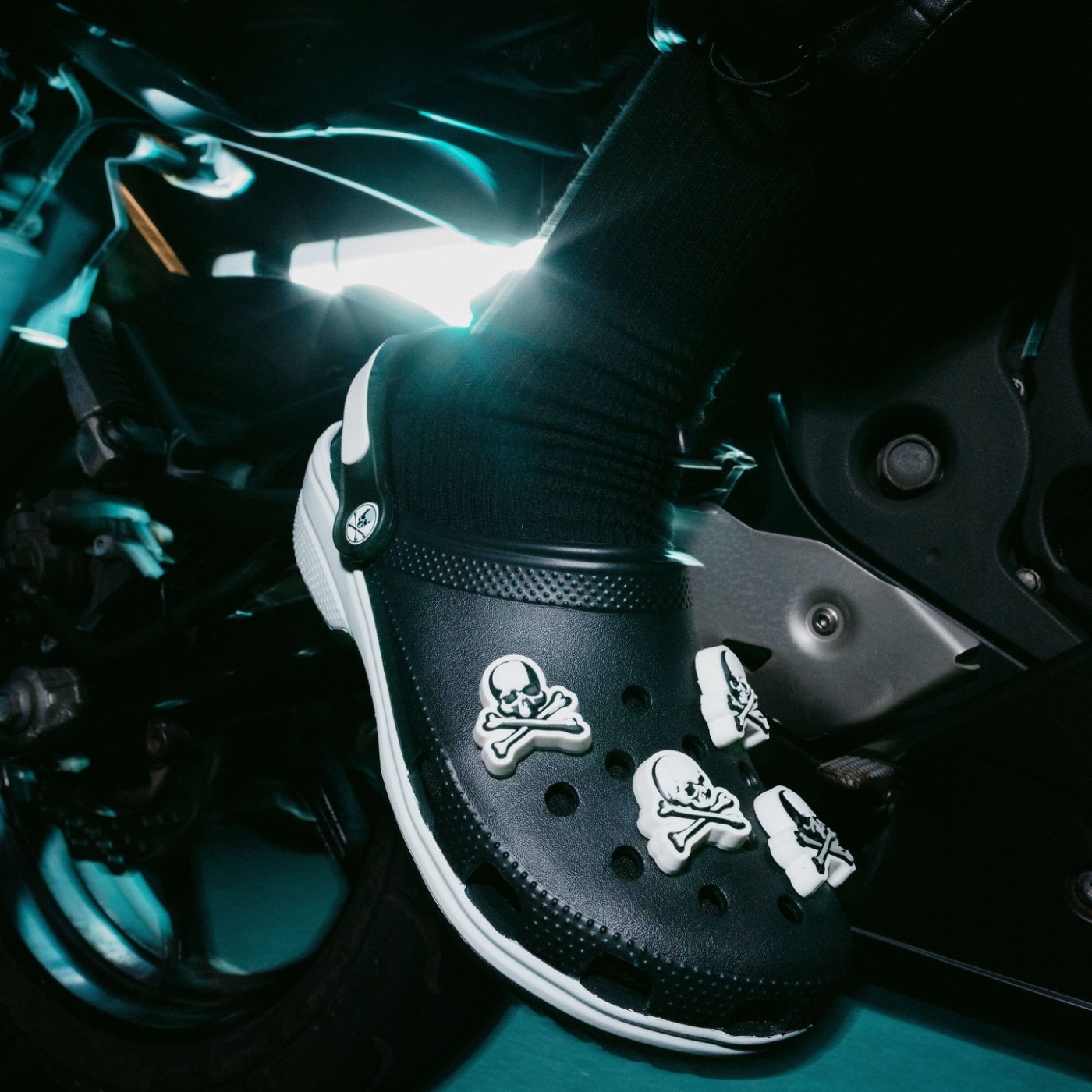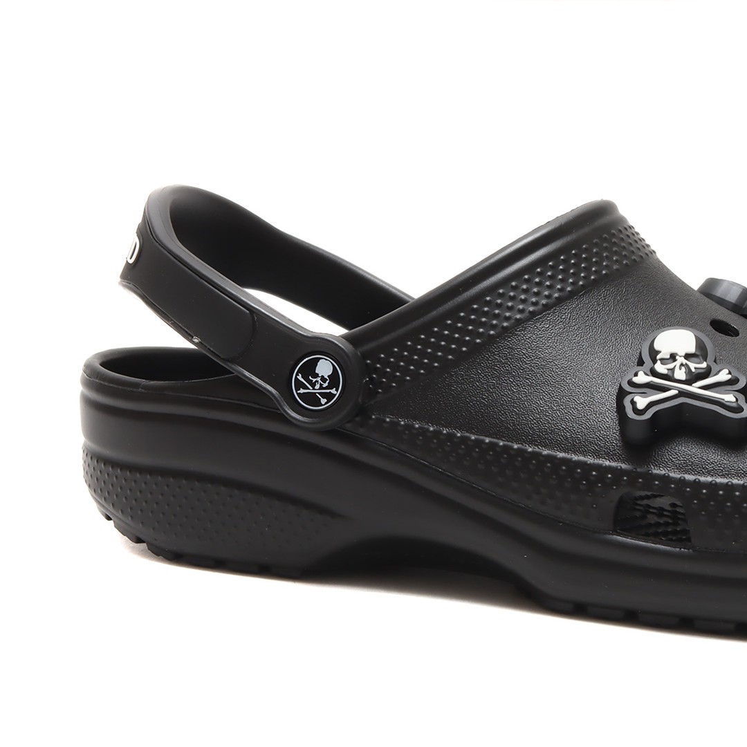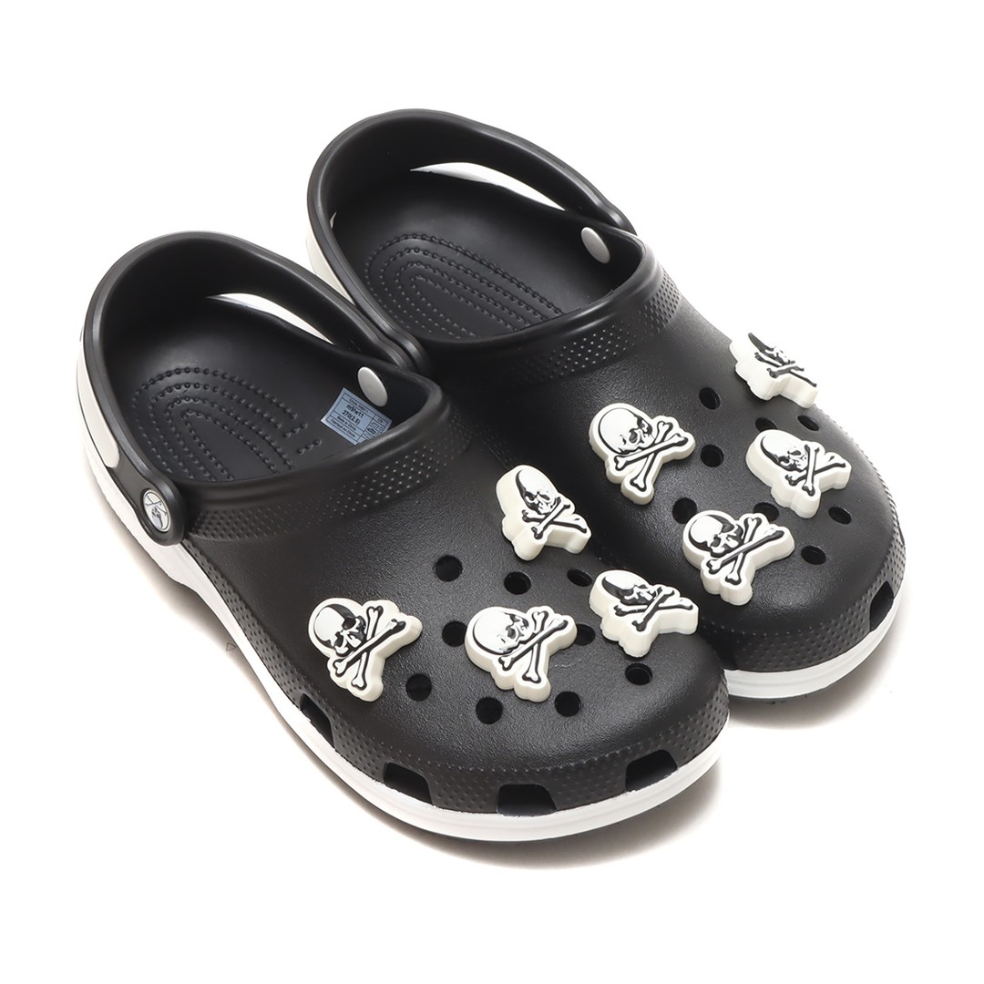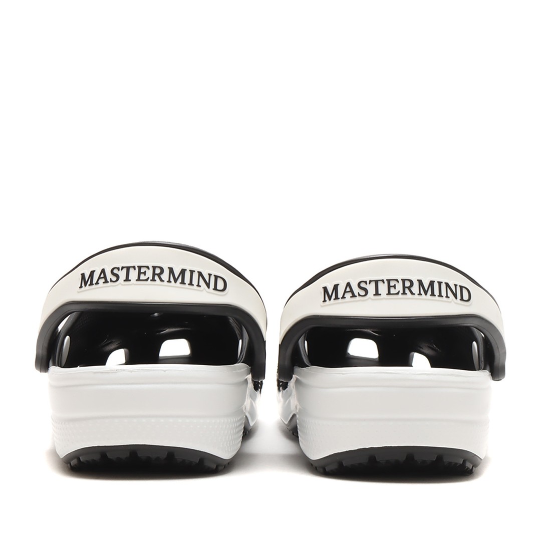 经典的 Crocs 沙滩鞋造型,搭配立体的 mastermind Japan Logo 骷髅头,视觉效果强烈。