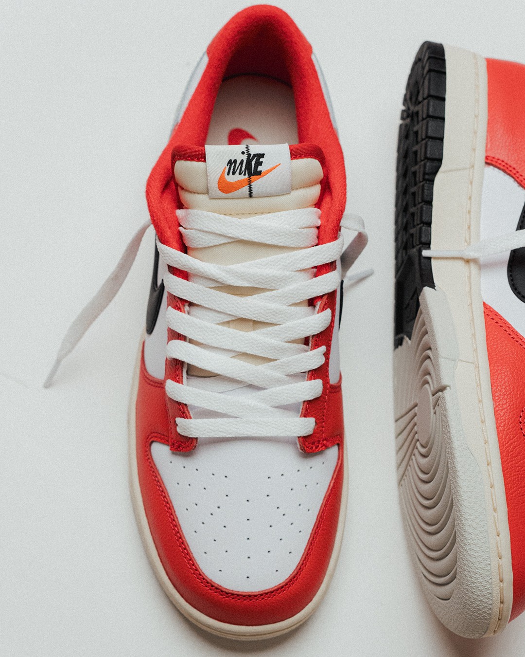 第一双采用有着超高热度的 Dunk Low 为蓝本进行创作,鞋身配色方案自然白红组成,在侧身 Swoosh 前段妆点黑色,视觉效果颇具层次感。