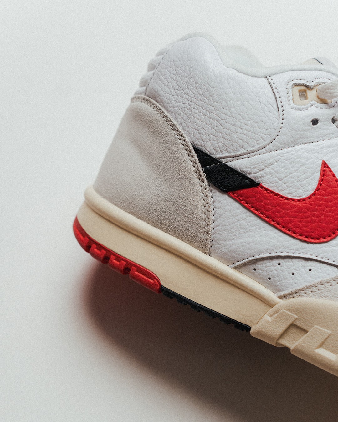 第二双则是近两年来的黑马鞋款 Nike Air Trainer 1,整双鞋以大面积白色为主调,仅仅在鞋头绑带、侧身 Swoosh 及外底点缀红色,百搭指数拉满。