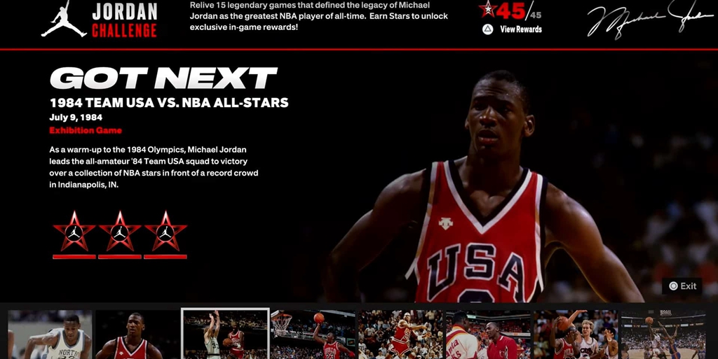 并且还有一点值得注意,就是现在的 2K23 里有一个「乔丹挑战模式」,玩家可以自己操控乔丹参与他生涯中的所有经典战役,类似于「剧情模式」。