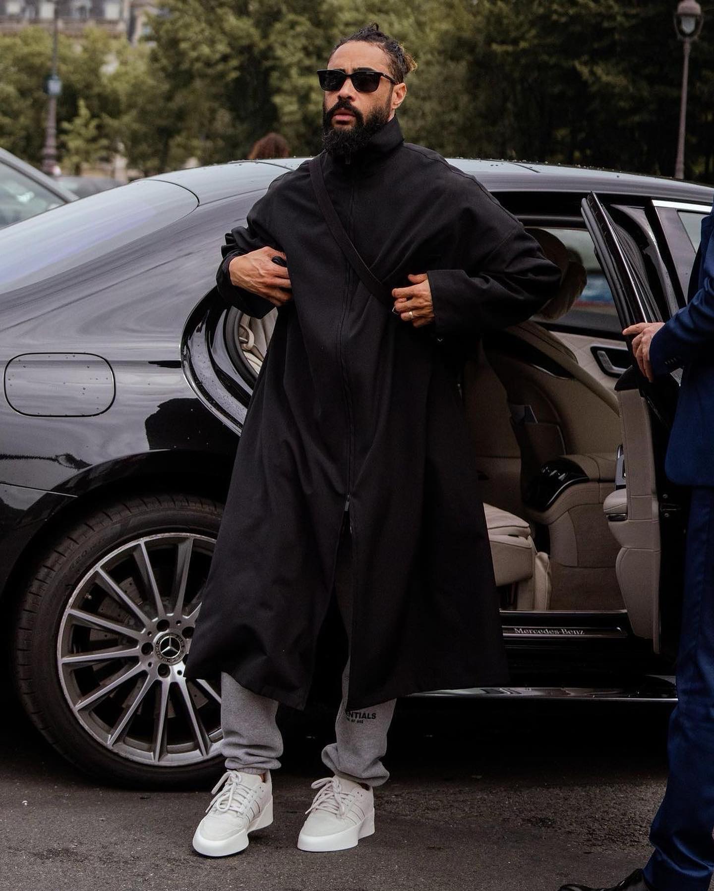 首先是 4 月 19 日大秀当天,好友 Pusha T 上脚的这双黑白配色。