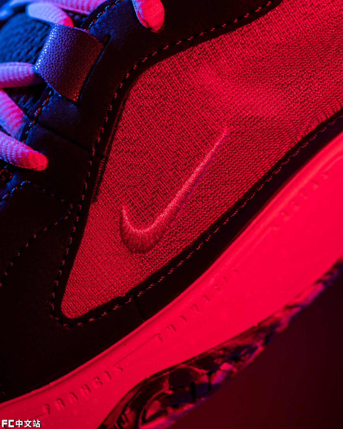 内外侧红色的轻薄透气网纱鞋面,内嵌 4 个针对性的鞋带「包裹系统」。