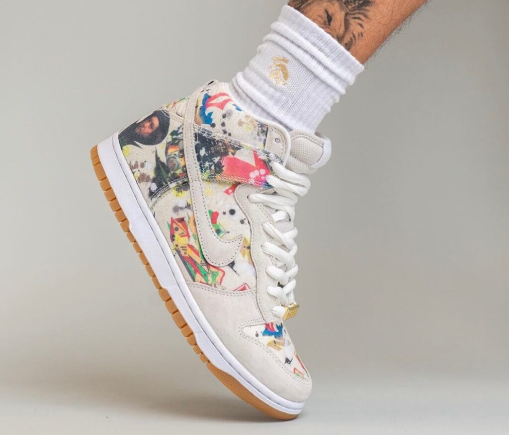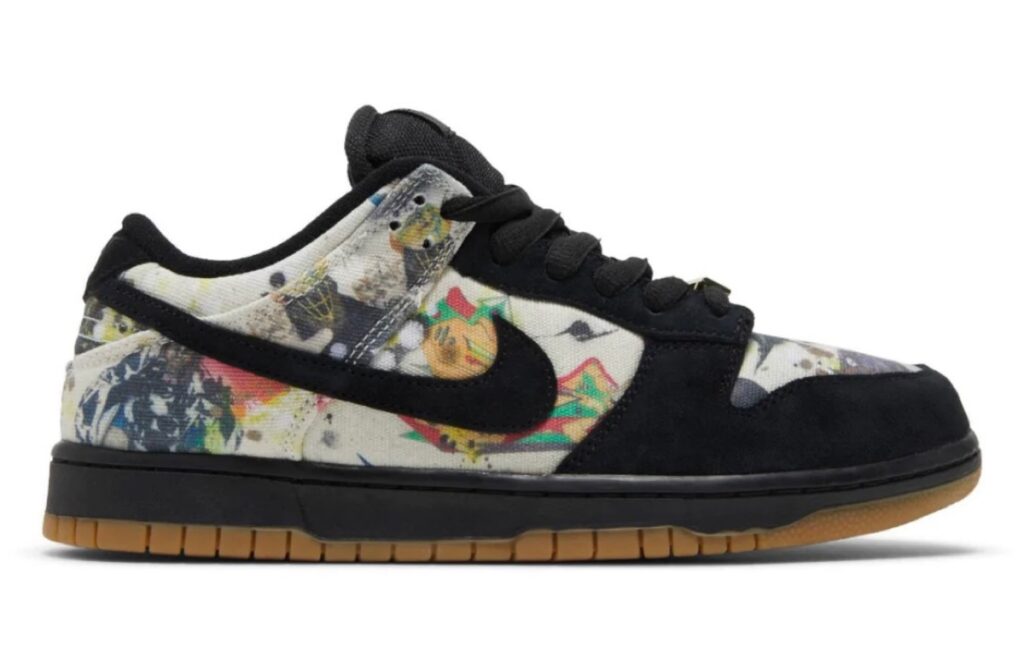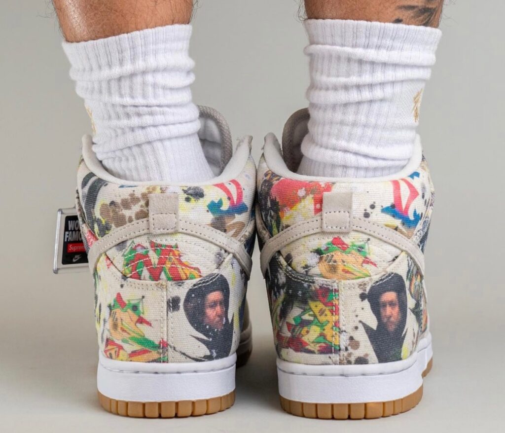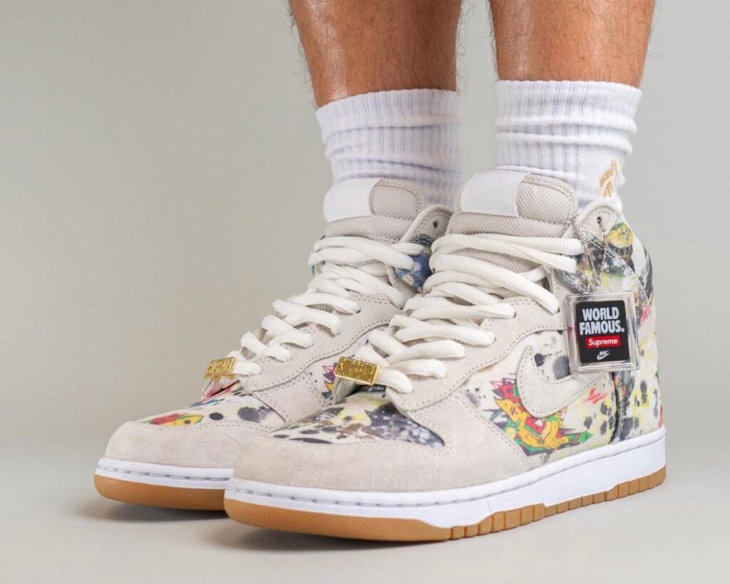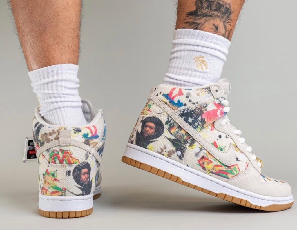 印花图案来自于艺术家 Rammellzee,鞋带配备了 Box Logo 造型的金属扣,让这双 Supreme 联名鞋更有街头感。