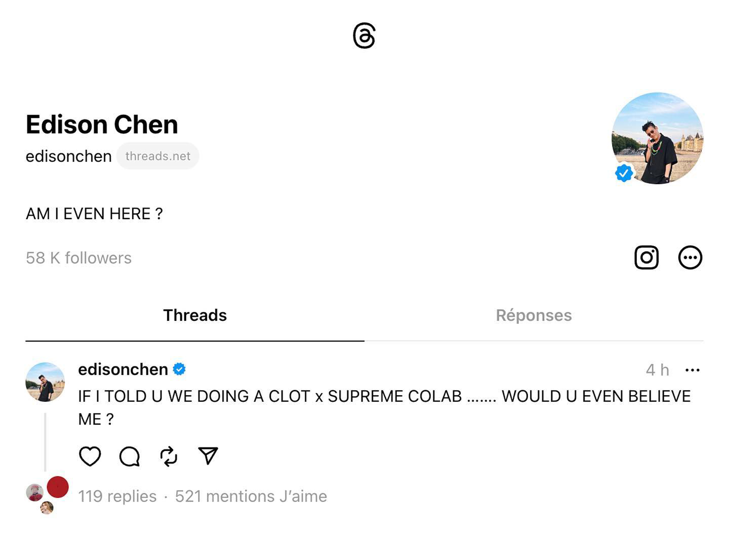 另外一则关于 CLOT 的消息,则是冠希在全新社交平台 Threads 上疑似暗示 CLOT 即将携手 Supreme 打造联名!