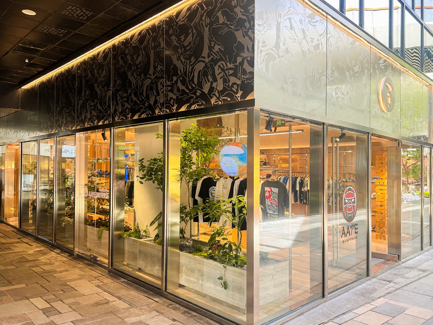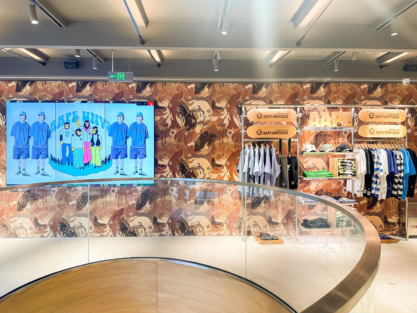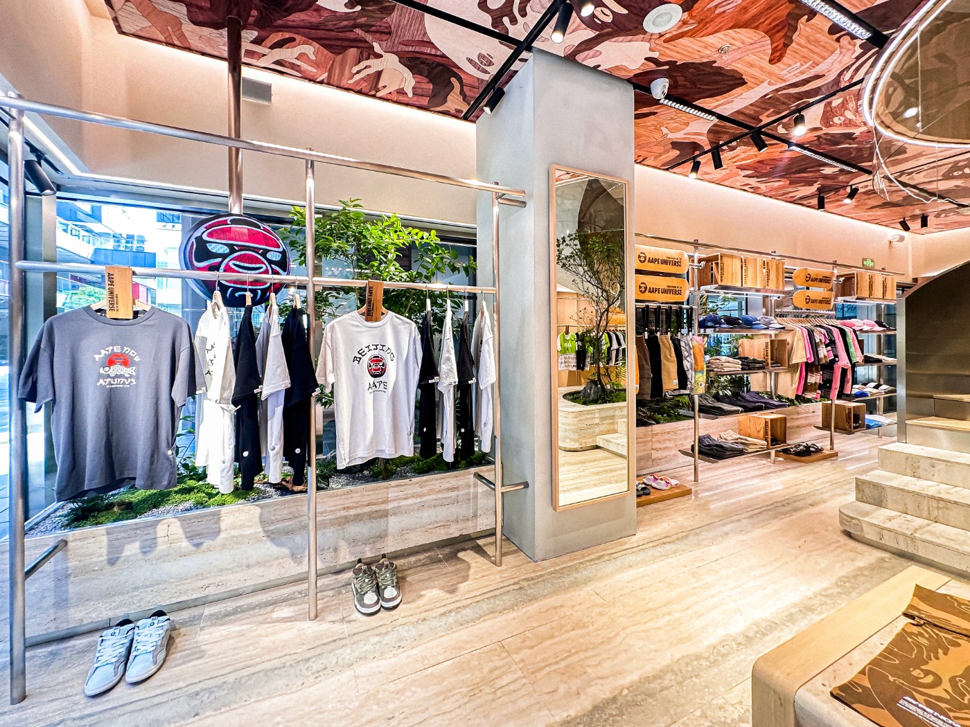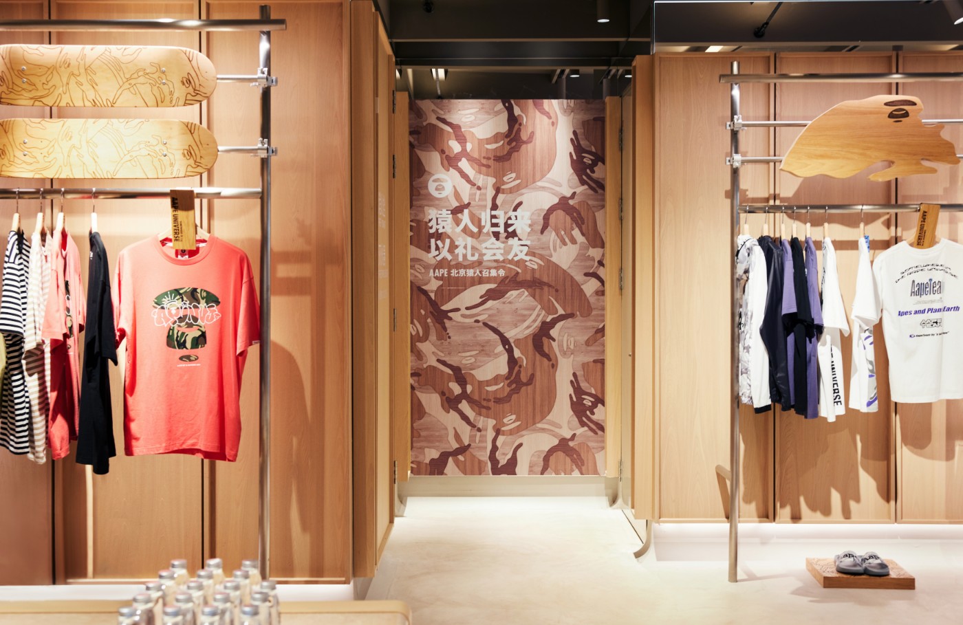 门头与店内天花板及墙体装饰采用原木色调,辅以精致的 AAPE 迷彩木纹肌理线条妆点,渲染自由随性的街头氛围。