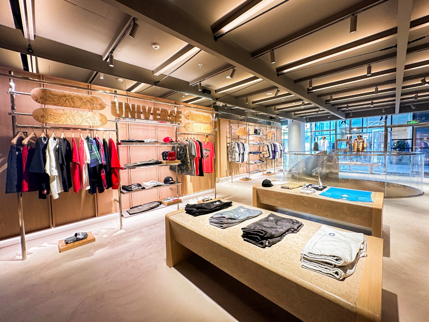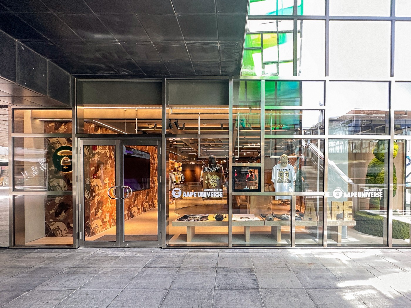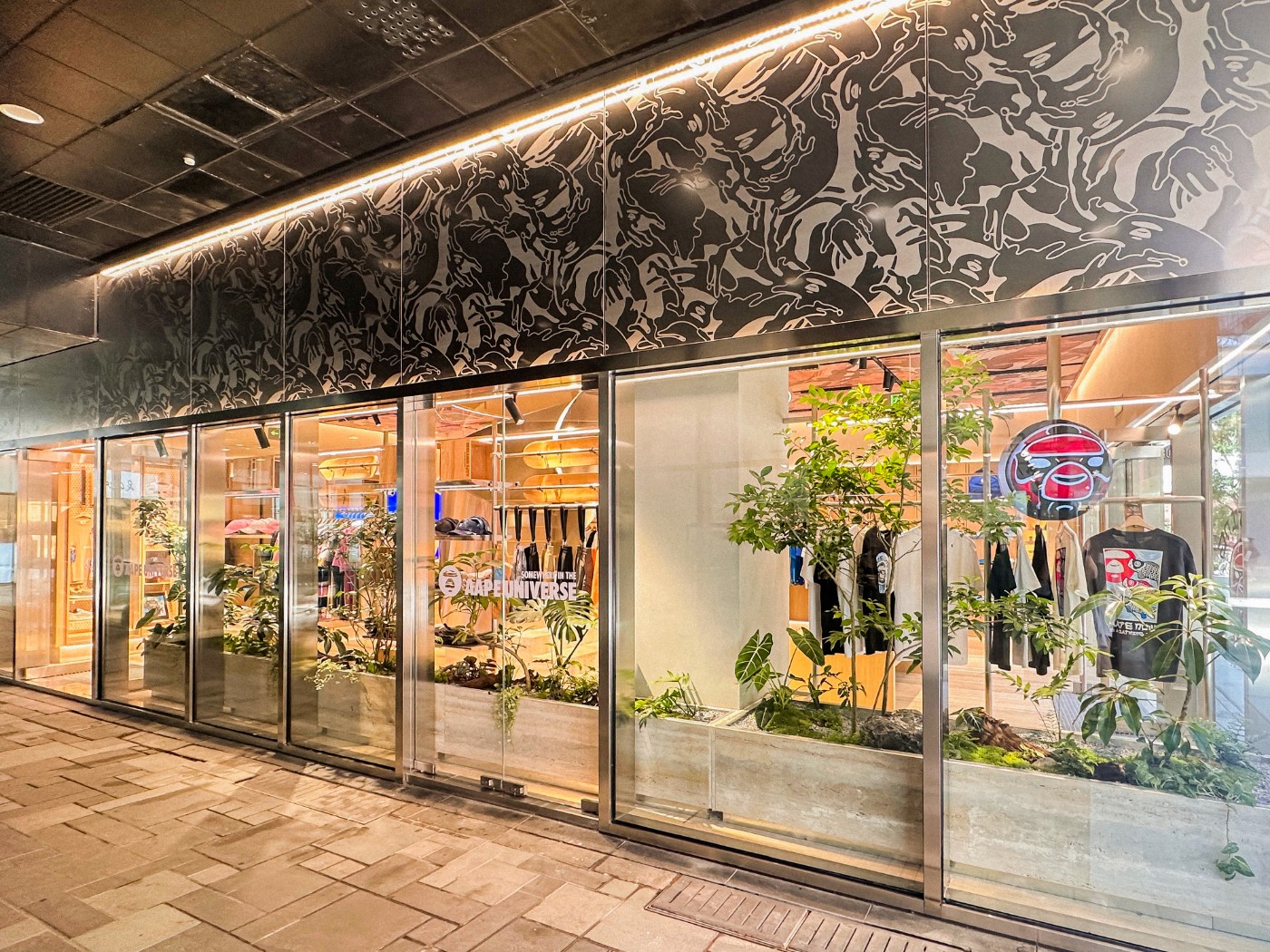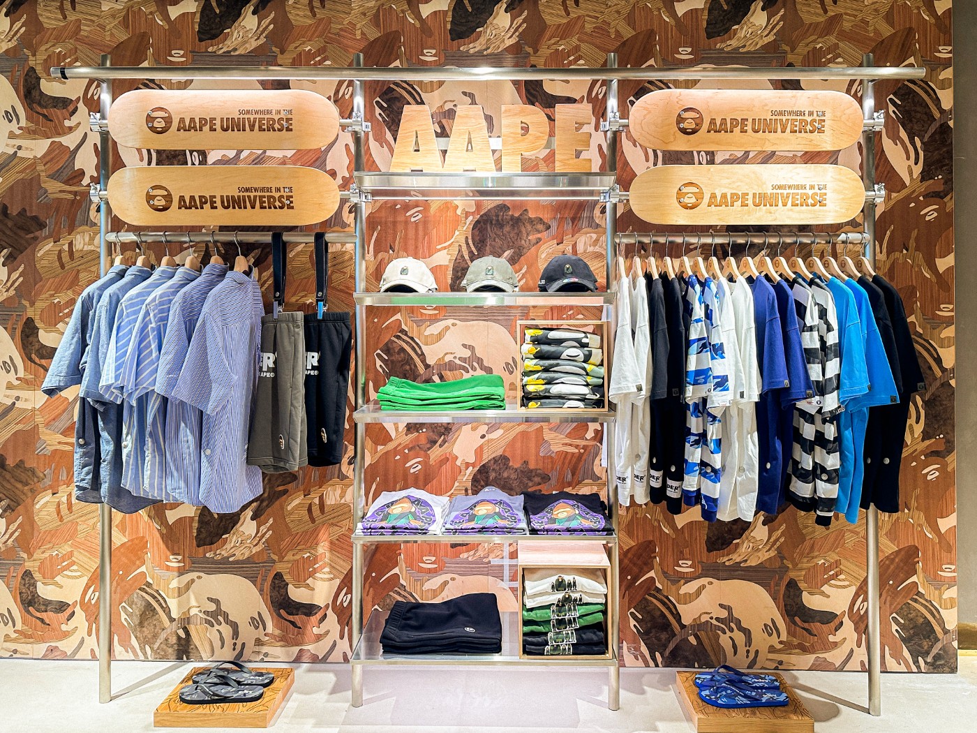 门头与店内天花板及墙体装饰采用原木色调,辅以精致的 AAPE 迷彩木纹肌理线条妆点,渲染自由随性的街头氛围。