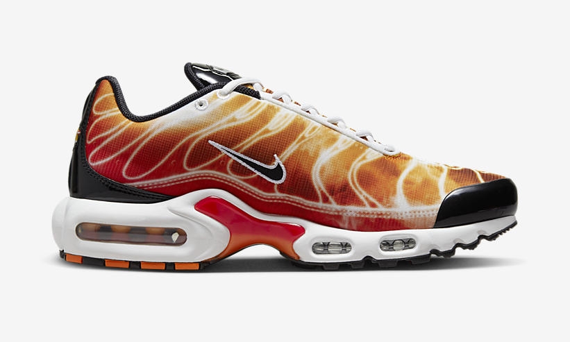 鞋面以渐变的火焰效果呈现,鞋侧标志性的龙骨采用白色线条点缀,给人以热浪炙烤的视觉感受。