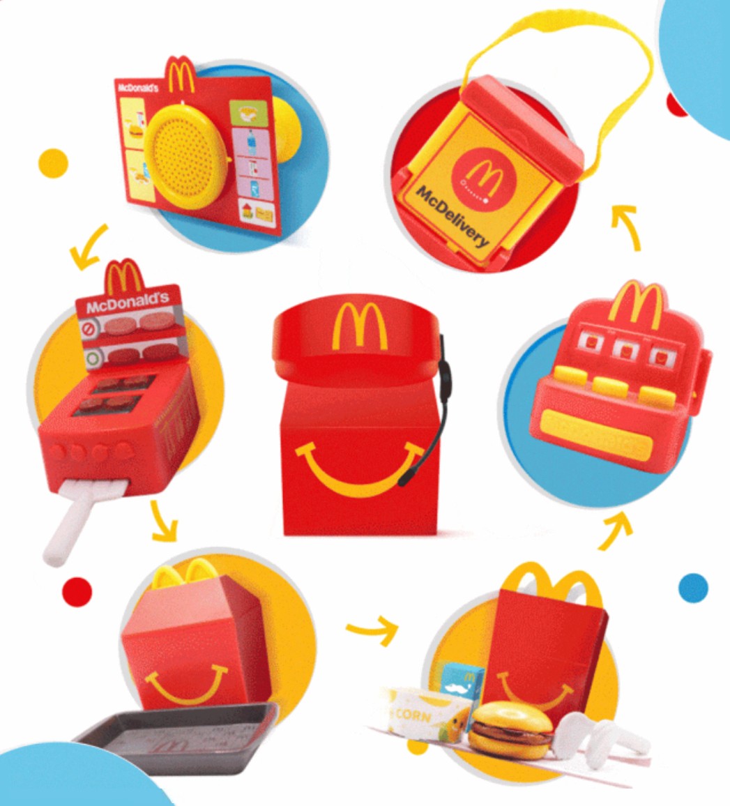 包含了点餐麦克风、肉饼烧烤机、餐盒和托盘、开心乐园餐、菜单收款机、麦乐送惊喜包以及店员遮板帽。
