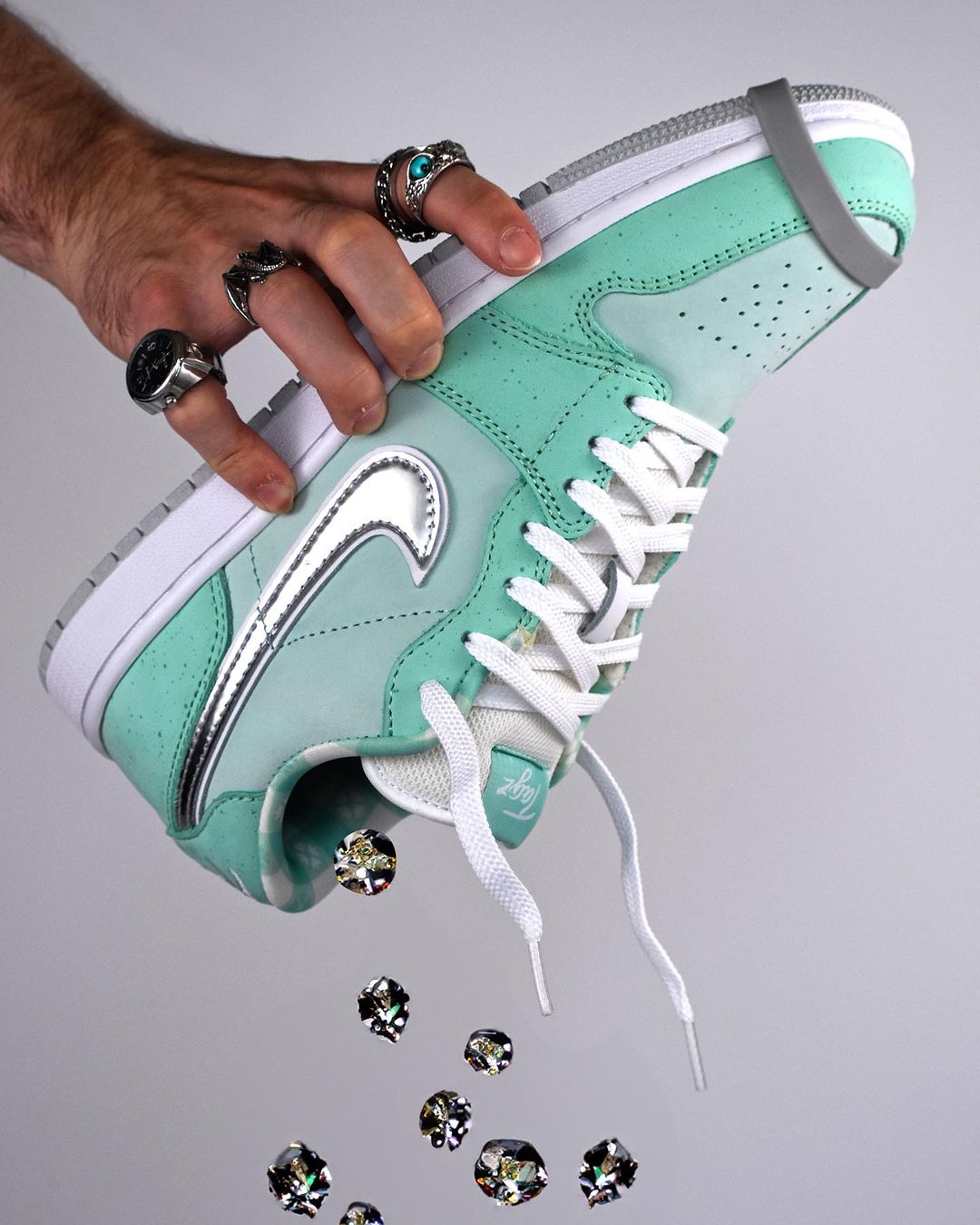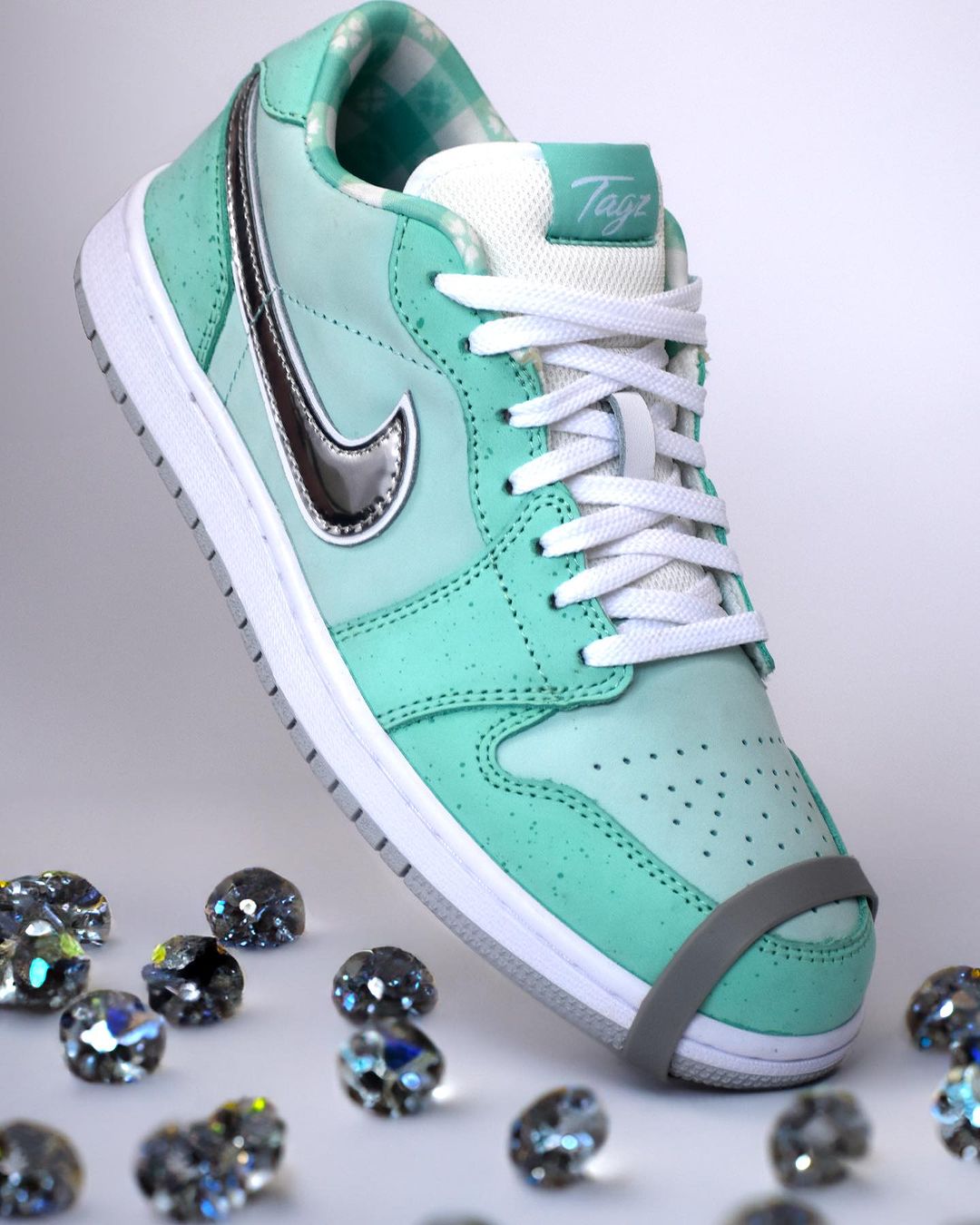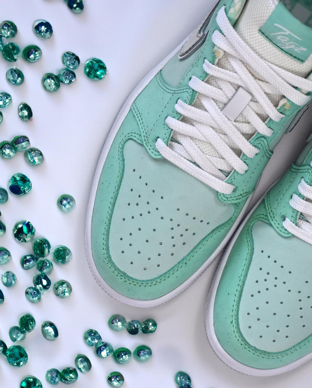 通过后跟刺绣可以看出这双「Tiffany 龙虾」出自球鞋定制师 tagzfootwear 之手。