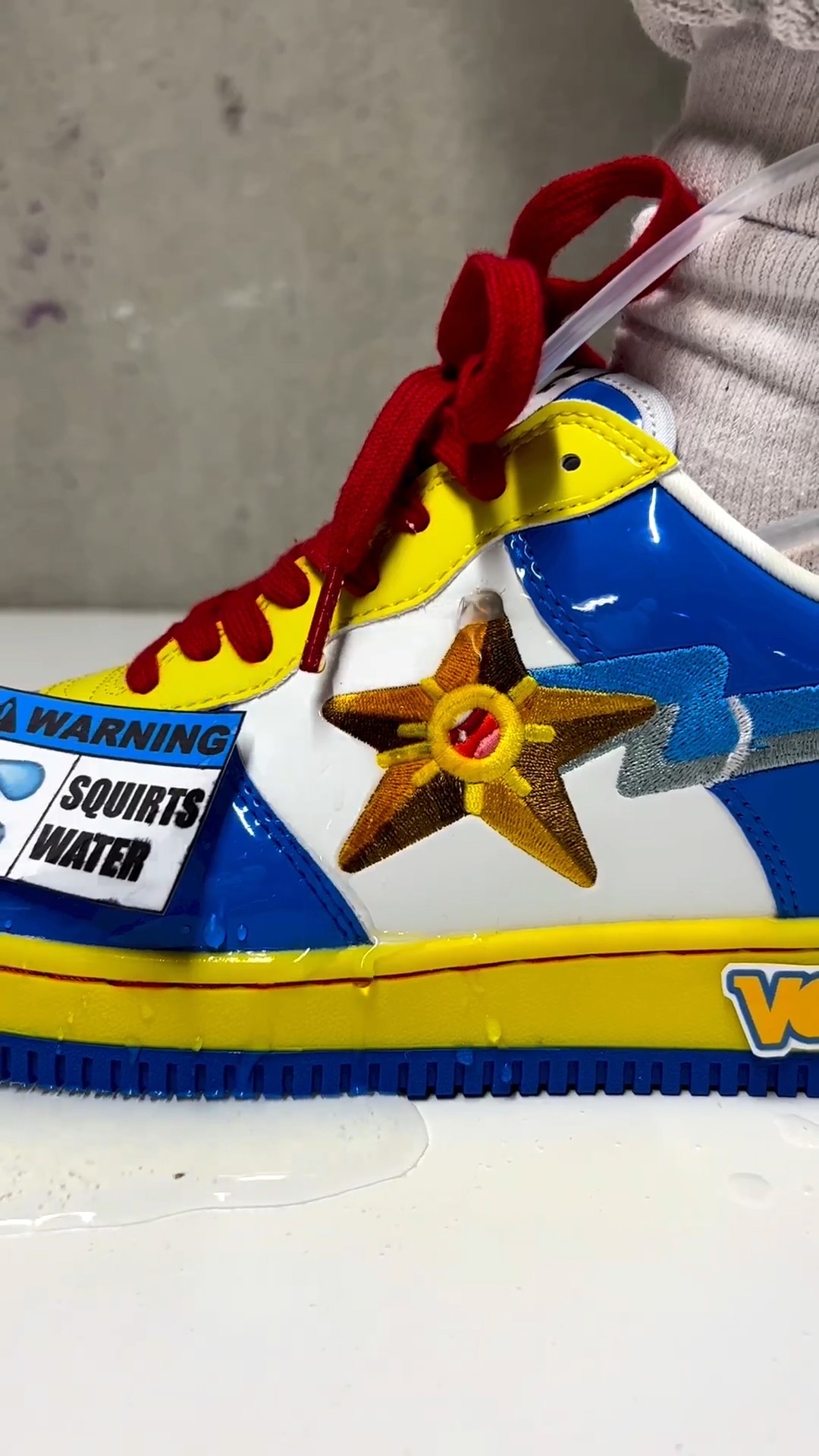 此次定制鞋款同样以宝可梦为主题,选择了「海星星」为灵感进行创作,使其外形和 BAPE STA 星标 Logo 完美重合,但它如果仅仅如此,倒也不足为奇。
