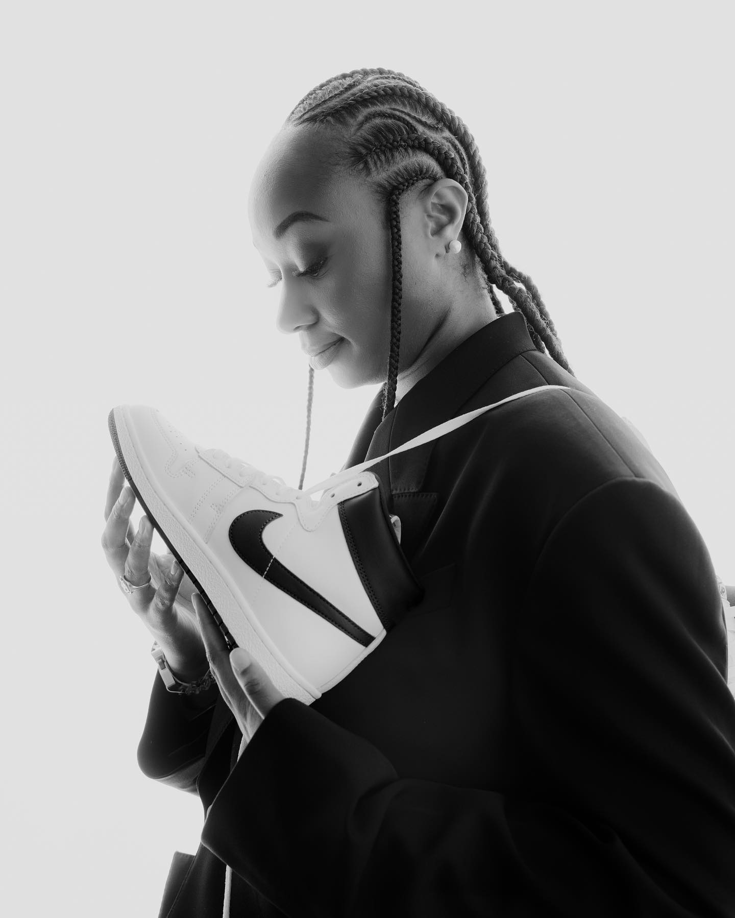 先说回球鞋,整双鞋采用经典大面积白色搭配黑色 Nike Swoosh 点缀,相较于去年推出的白蓝配色,更加复古百搭。
