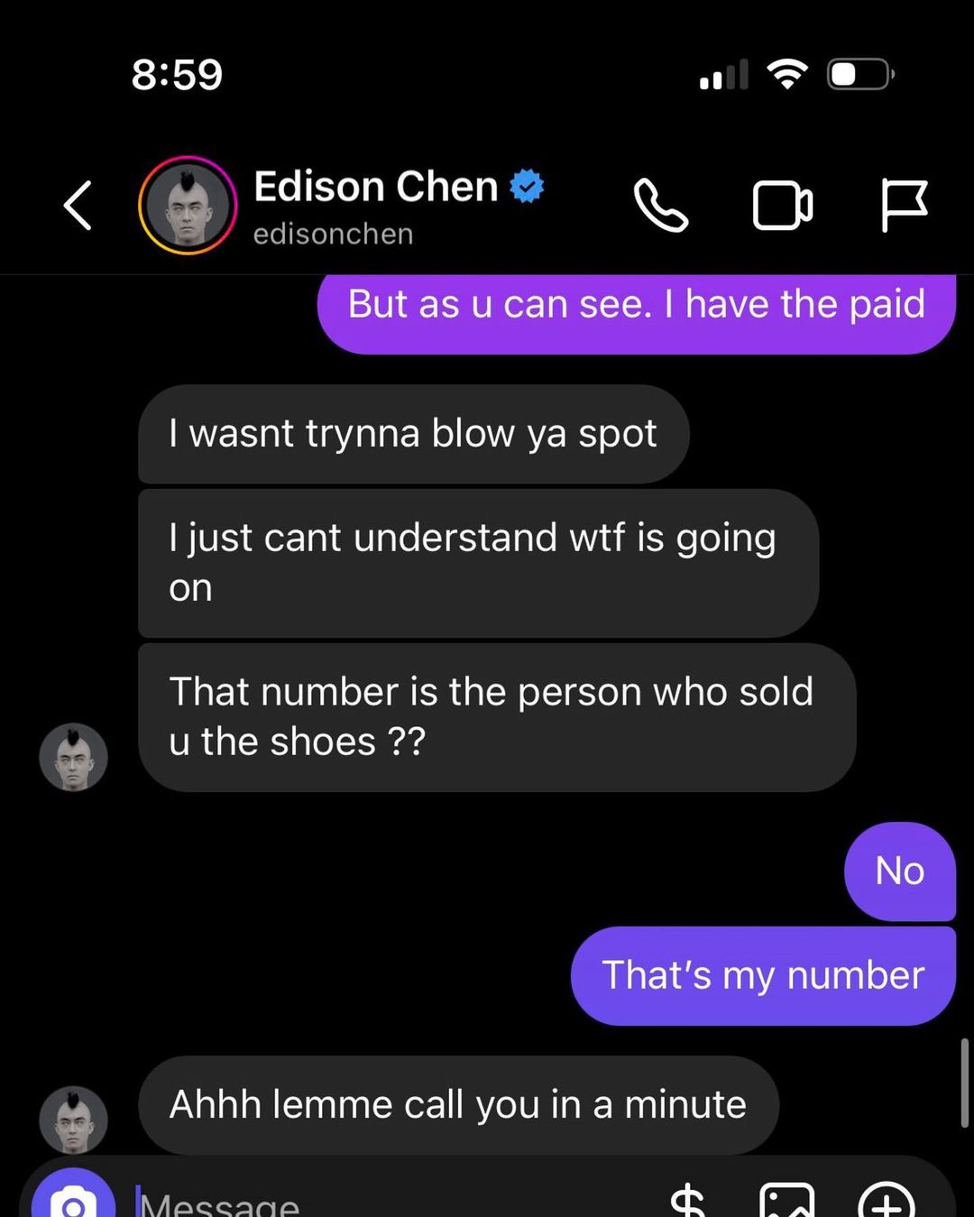 很快冠希便与此人取得了联系,从二人通电话前的聊天内容看出对话还是相当和谐的。