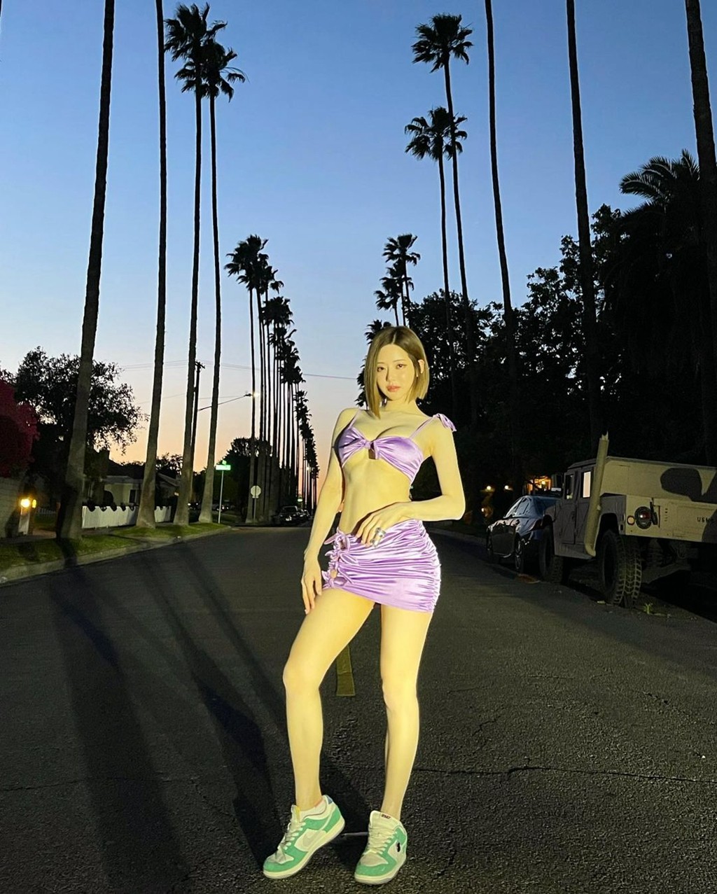 看完吊带,咱们再来看看连体泳……啊不是,再来看看她脚下的这双 MLB 洞洞鞋,一体发泡材质不仅有着强大的涉水性,还有着不俗的增高效果。