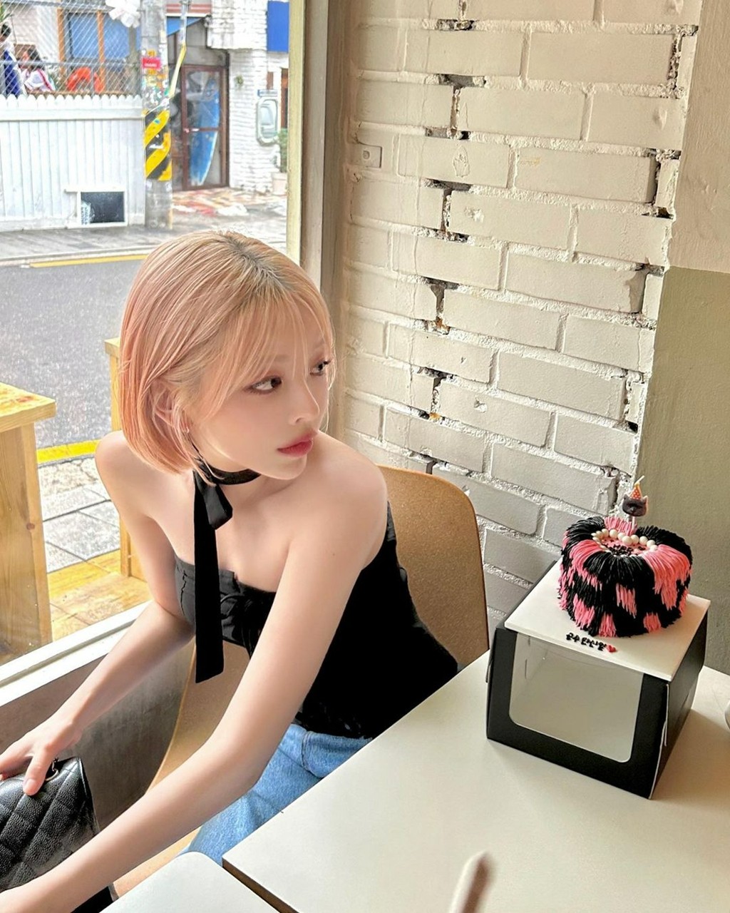 度假之余,最近还赶上她过生日,那怎么能不营业呢?黑色抹胸上衣搭配造型别致的小蛋糕,主打的就是一个开心。