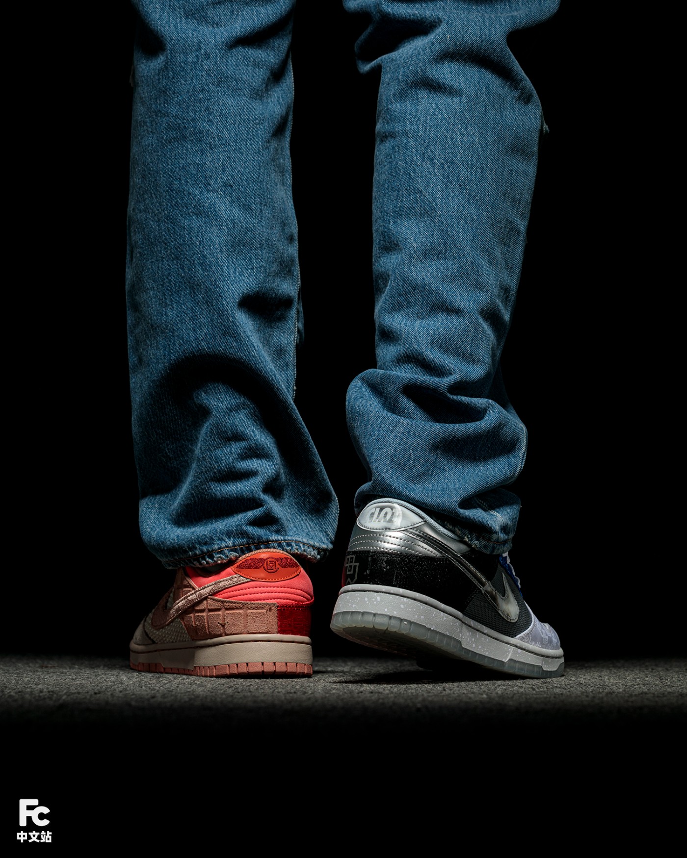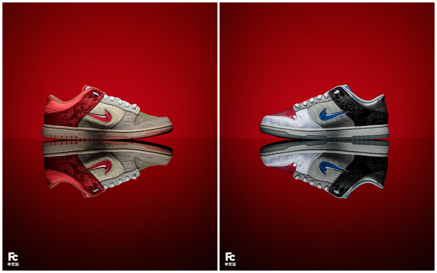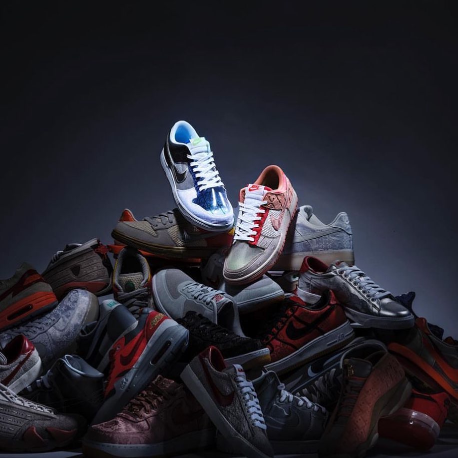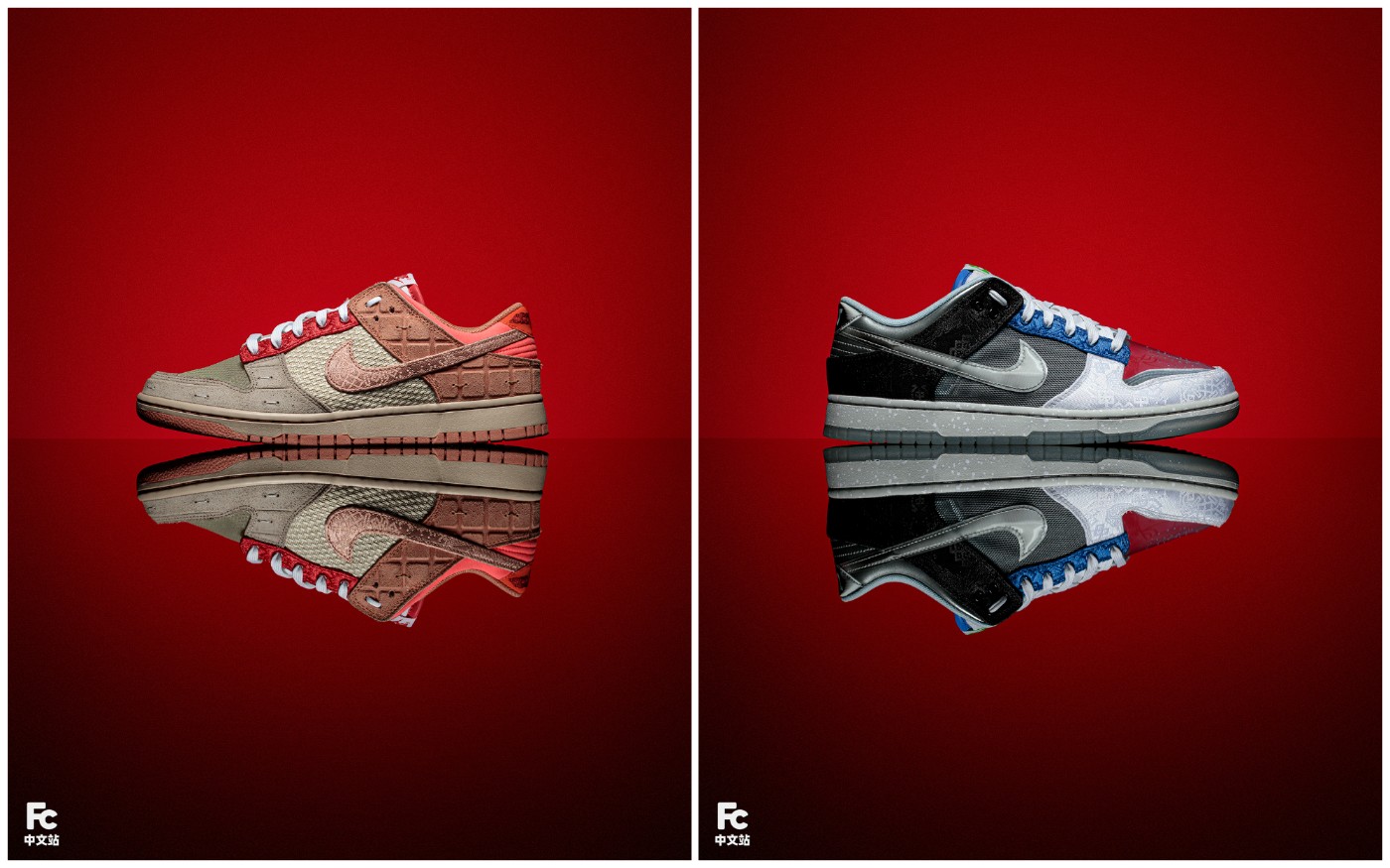 左、右鸳鸯装扮,鞋身浓缩了 CLOT 与 Nike 自 2006 合作开始,17 款不同年份联名的经典元素。