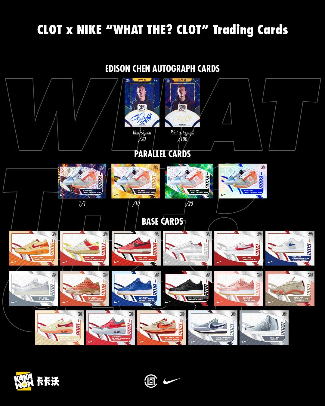 整套卡牌共有 23 款设计,其中 17 款基础卡,分别对应 What The? CLOT 中选用过的鞋款。另外还有以本次鞋款为主题的 4 款平行卡,其中黑卡最为稀少,为 1 of 1。